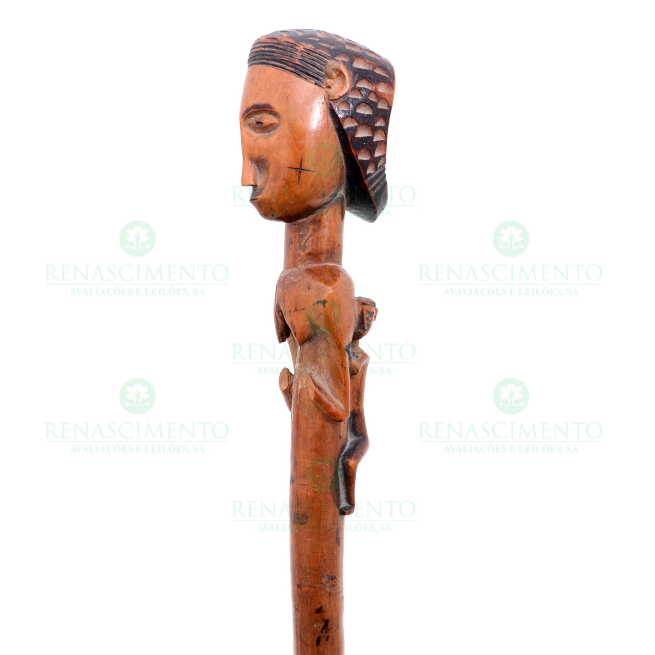 em madeira exótica, natural e escurecida representando maternidade, com patines e desgastes naturais, Séc. XIX. Faltam mãos. Alt.: 43 cm.