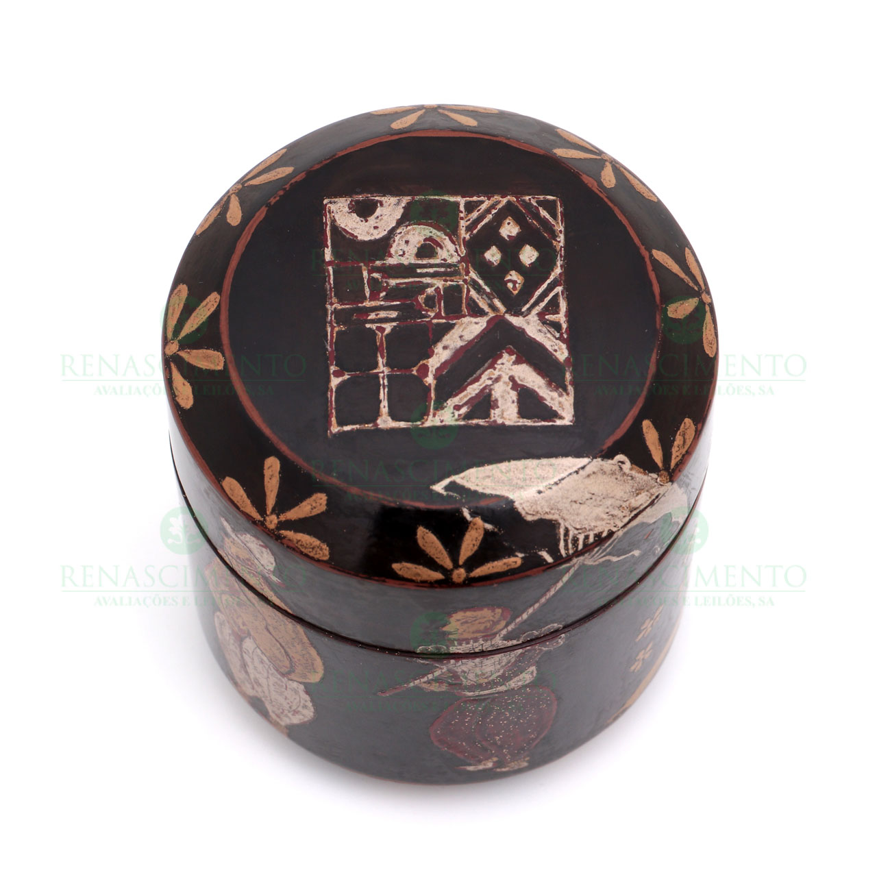 de formato cilíndrico, lacada a preto, ouro e coral, representando figuras de portugueses e flora local. Encimada por armas de família portuguesa não identificada. Japão, período Edo (1603-1868). Peça de colecção. Dim.: 7,5x7,5 cm.