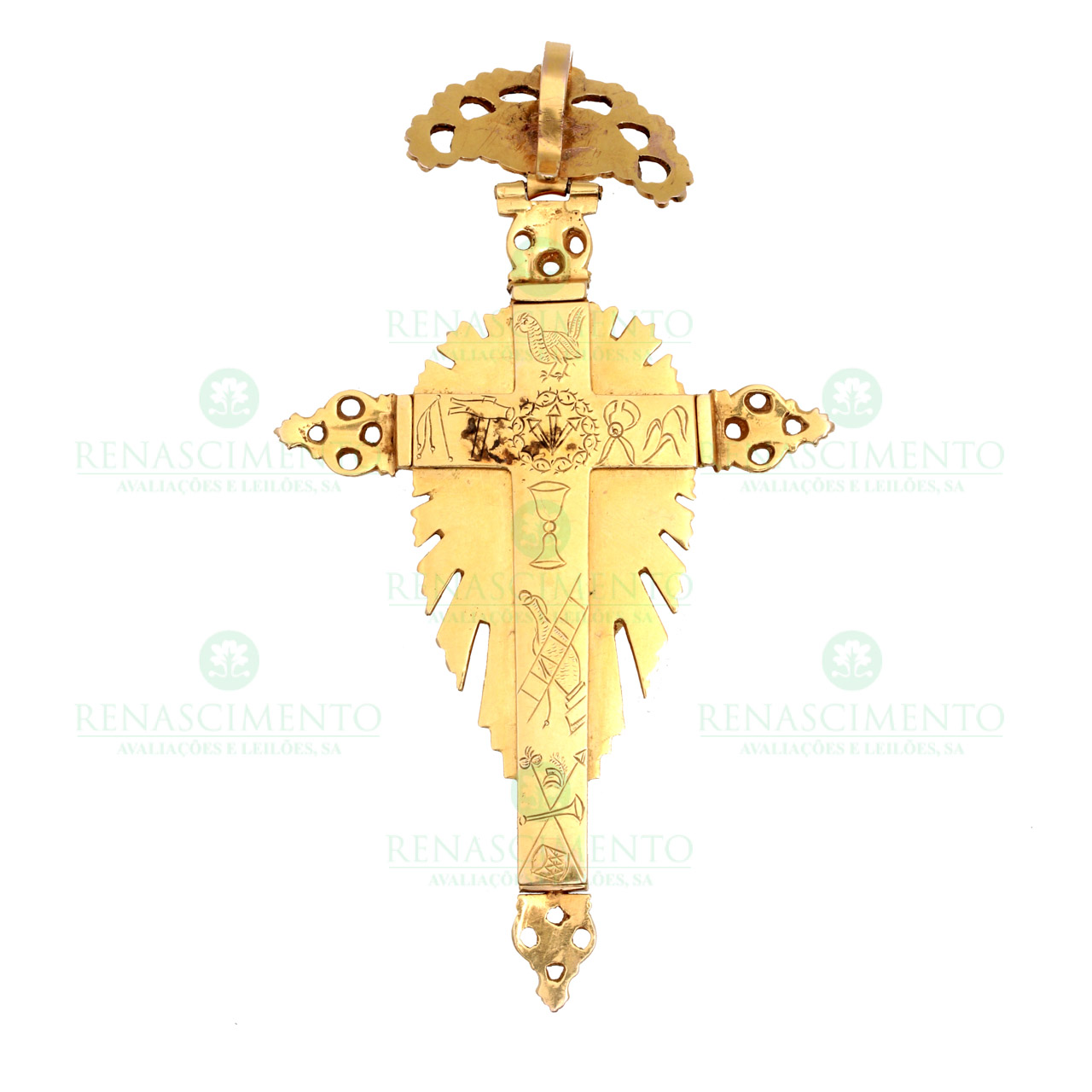 em ouro, sem marcas, ao abrigo do Decreto-Lei nº 120/2017, de 15 de Setembro - art. 2º, nº 2, alínea c), decoração relevada e cinzelada. No verso ostenta símbolos da Paixão. Sistema de rosca no terminal inferior. Peso: 63,4 g.