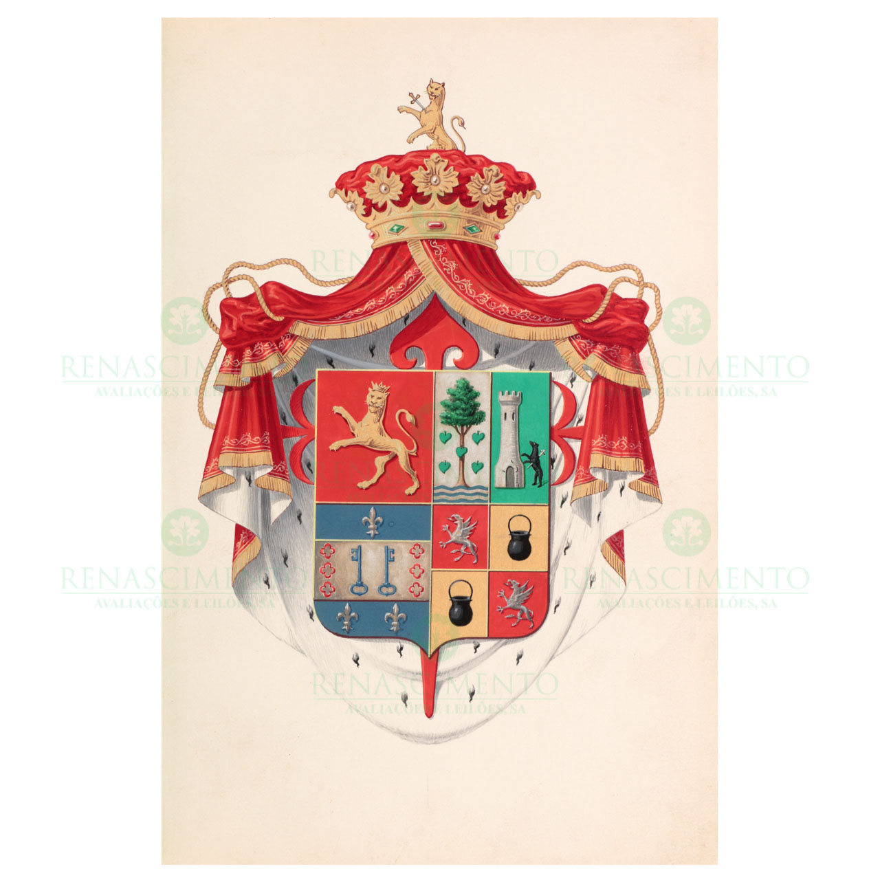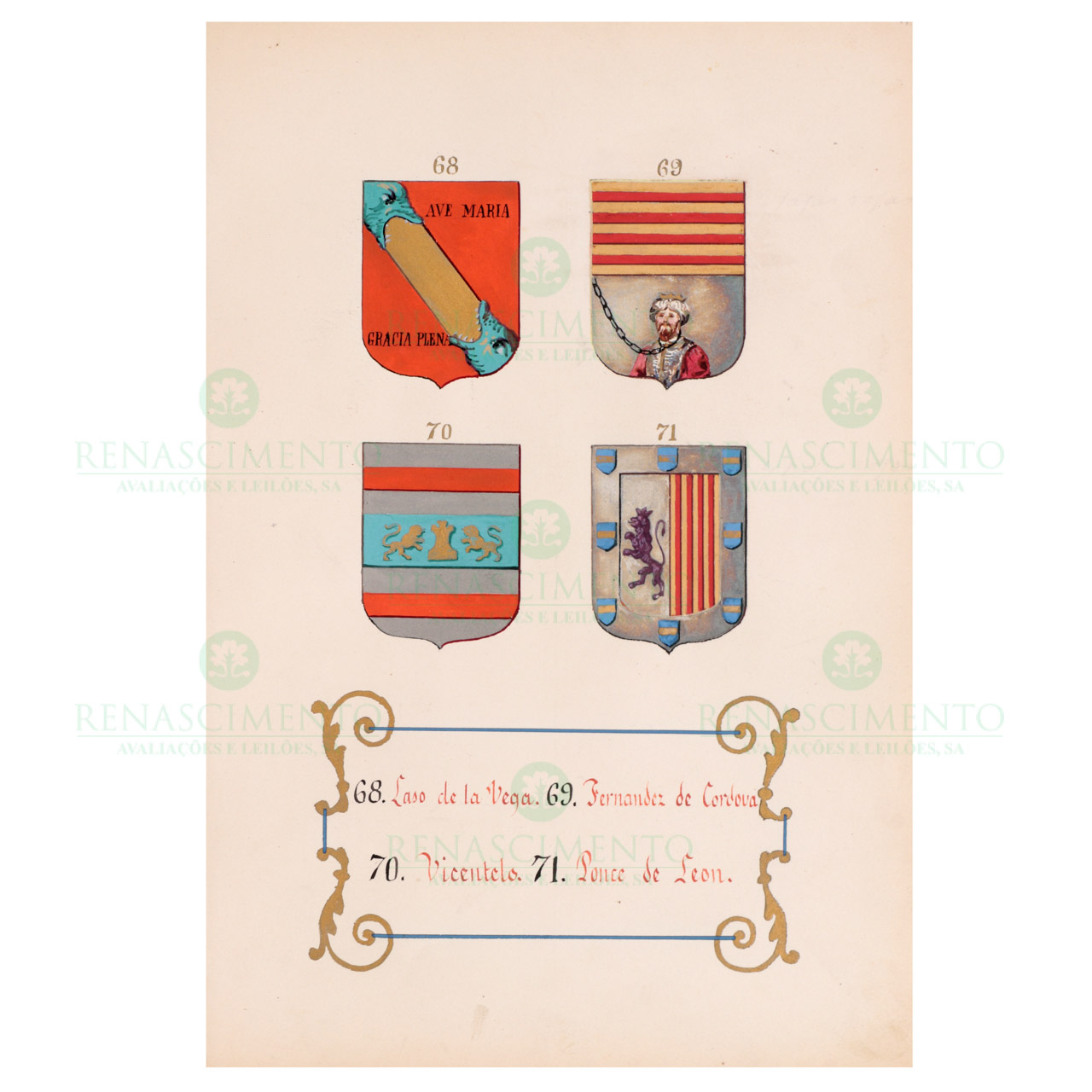 Manuscrito de bela composição caligráfica. Portada desenhada com o Brasão de Armas desta família iluminada a ouro, prata e a cores e ilustrada com 81 brasões iluminados com esmalte e cores. Encadernação artística em pele vermelha com ferros a ouro com brasão Real do Rei Afonso XII nas pastas. Acondicionado em uma pasta.