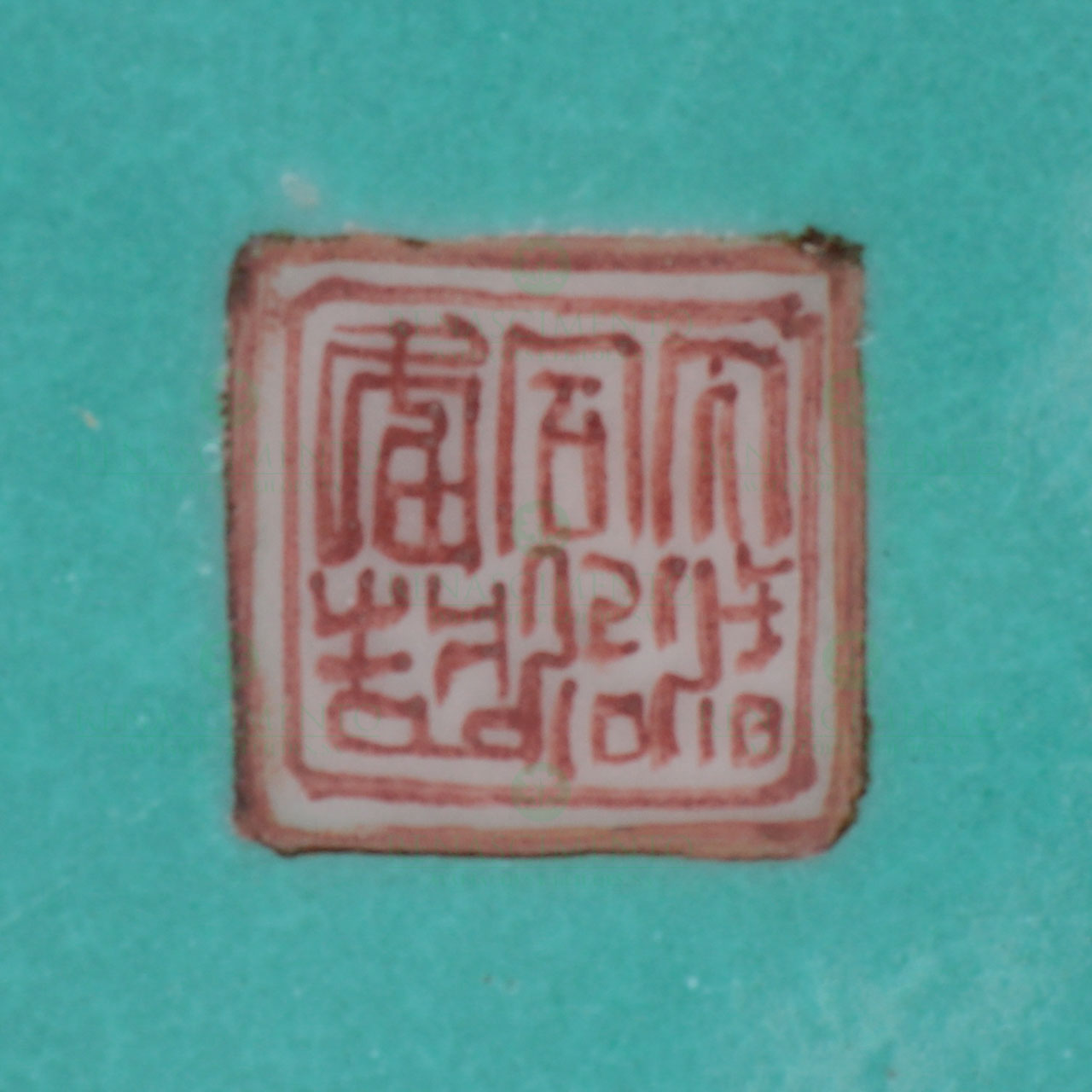 em porcelana chinesa, Dinastia Qing, sendo uma do Reinado Tongzhi (1862-1873), marcada, decorações policromadas e interior monocromo turquesa. Sinais de uso e uma com pequenas esbeiçadelas. Dim.: 13,5x13,5 cm e 19x14,5 cm.