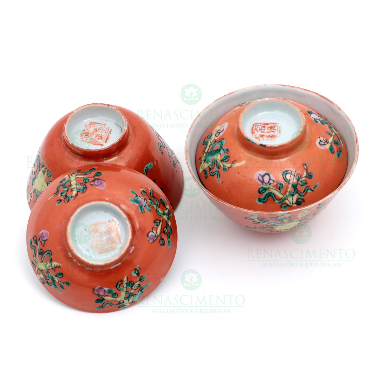 em porcelana chinesa, Dinastia Qing, Séc. XIX, decoração policromada sobre fundo laranja. Marcadas. Uma taça e uma tampa com ínfimas esbeiçadelas. Diam..: 10 cm.