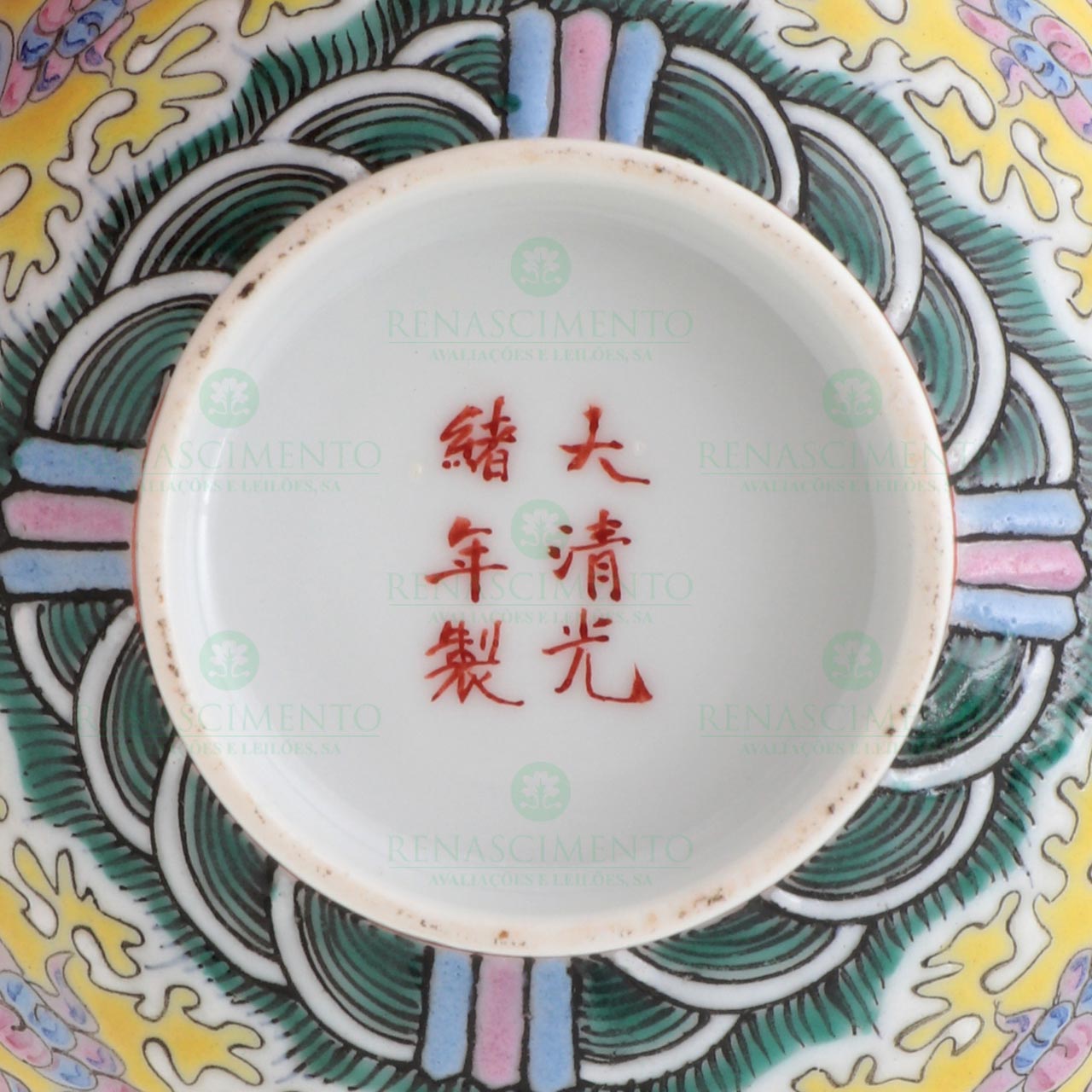 em porcelana chinesa, Dinastia Qing, Reinado Guangxu (1875-1908), decoração policromada sobre fundo amarelo, cartelas com caracteres e interior a coral com morcegos. Marcadas. Diam.: 11 cm.