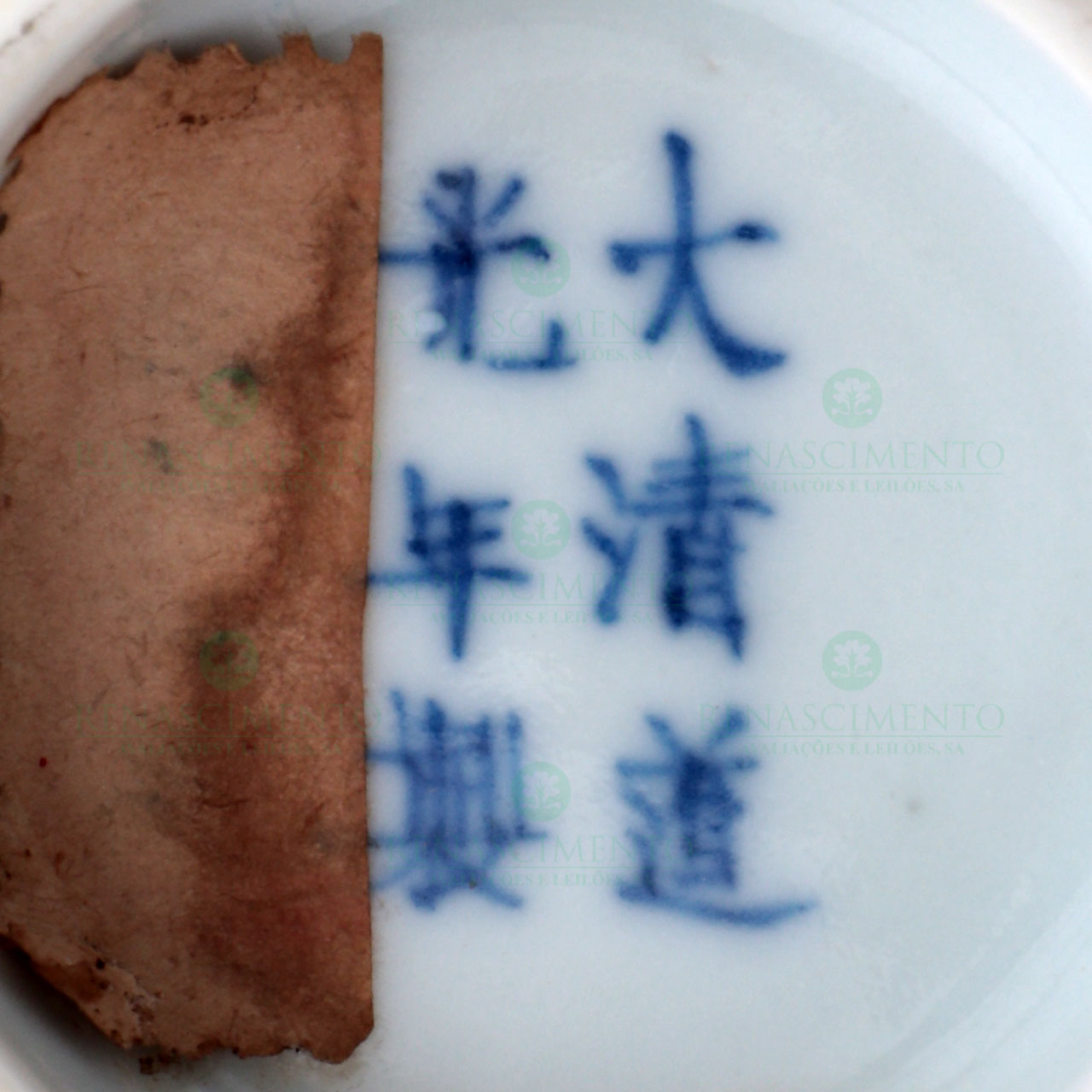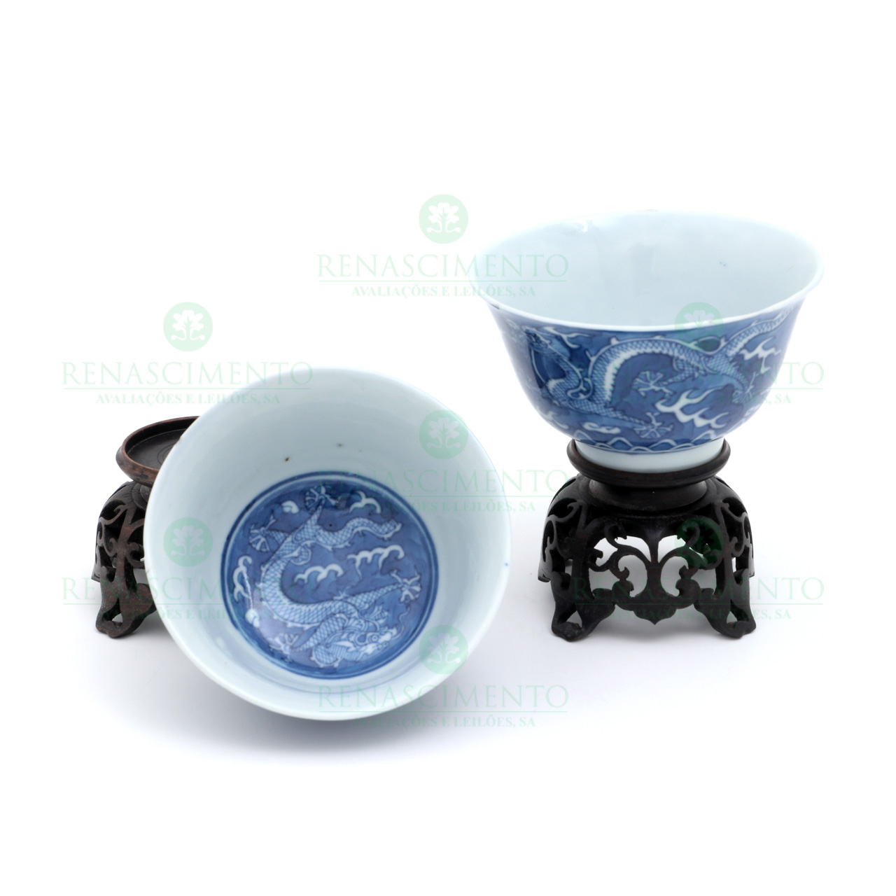 em porcelana chinesa, Dinastia Qing, decoradas a azul e branco com dragões, nuvens e símbolos. Marcadas. Bases em tamarindo vazado. Ínfimas esbeiçadelas. Diam.: 9,2 cm.