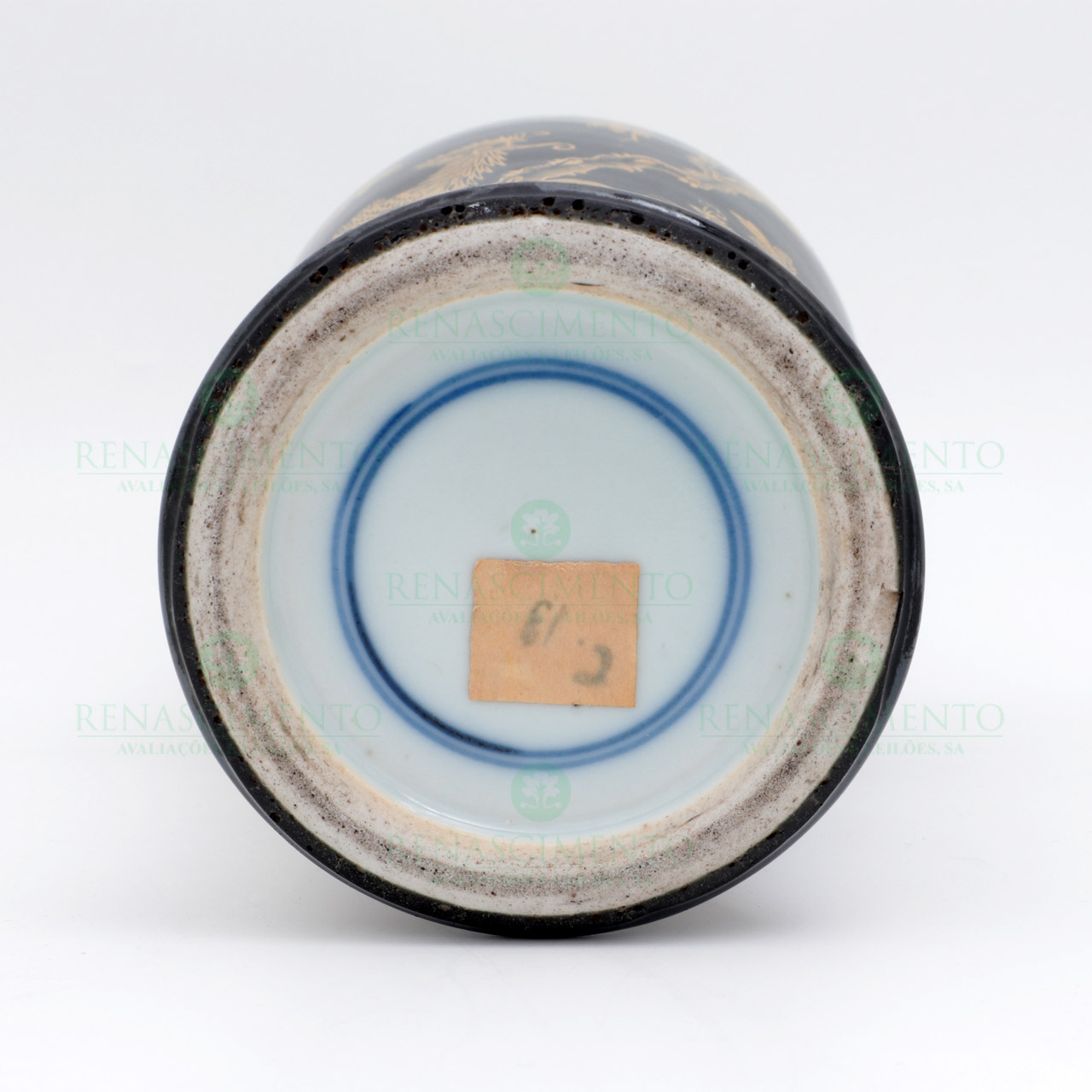 em porcelana chinesa, Dinastia Qing, Séc. XIX, decoração a ouro sobre fundo negro representando motivos florais com grous e outras aves. Marcada com duplo círculo. Desgastes no ouro. Alt.: 35,5 cm.