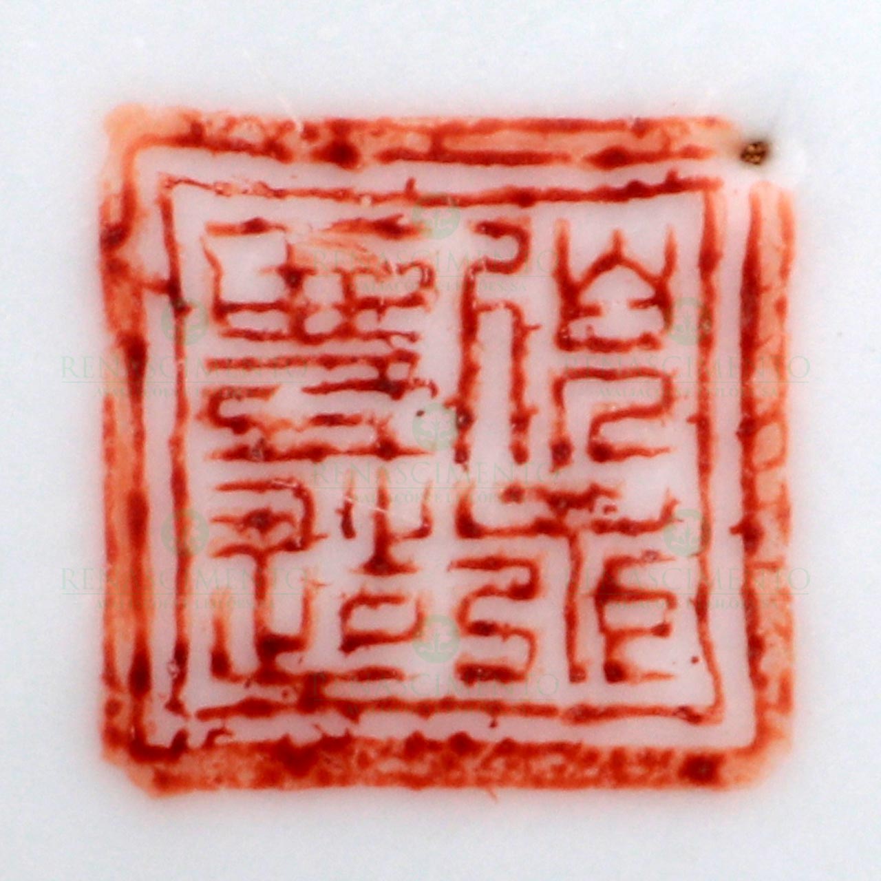 em porcelana chinesa de exportação, Dinastia Qing, Séc. XIX, decoração a coral e ouro com morcegos e suásticas, com reservas da Família Rosa representando pássaro em tronco e motivos florais e outras com caracteres a coral. Pegas em metal. Marcado.Dim.: 17x19 cm.