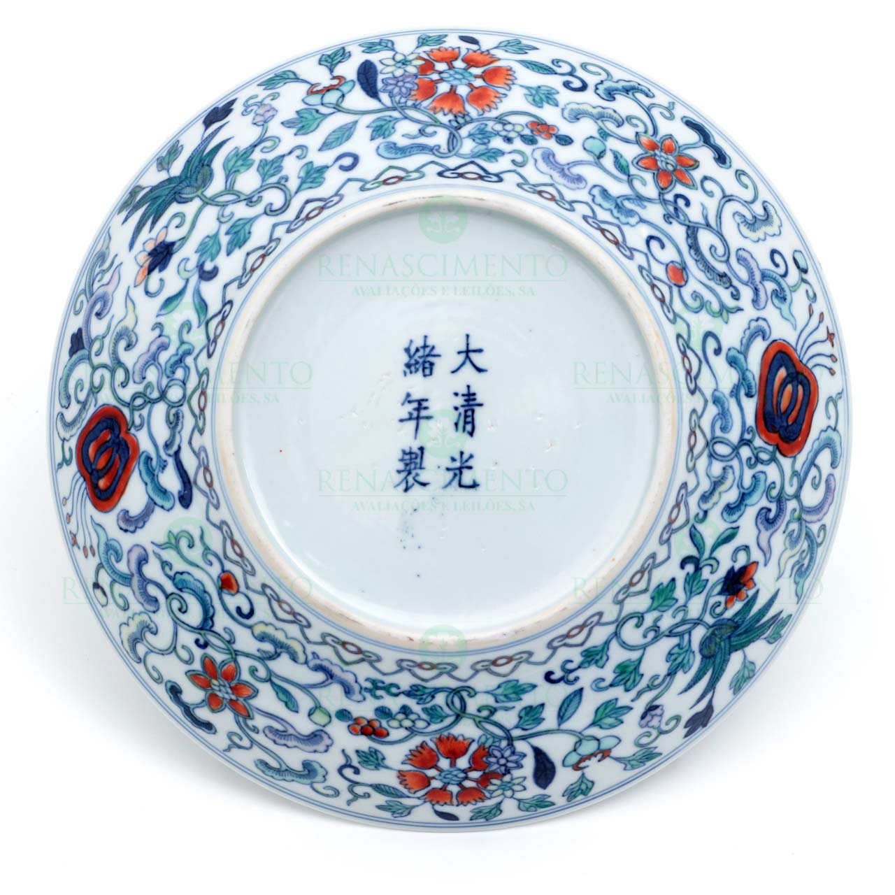 em porcelana chinesa, Dinastia Qing, decoração Wucai. Marcas apócrifas Qianlong. Diam.: 21 cm.