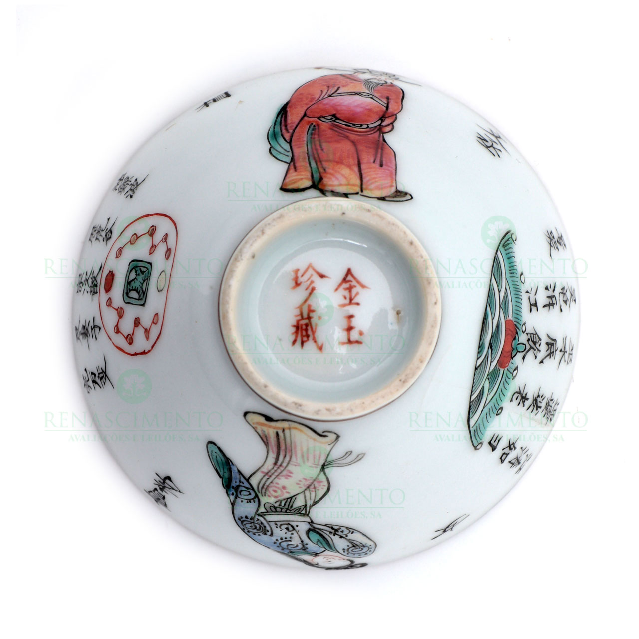 em porcelana chinesa, Dinastia Qing, Séc. XIX, decoração ricamente policromada com casal, poemas e caracteres. Marcada. Cabelo. Diam.: 6,5 cm.