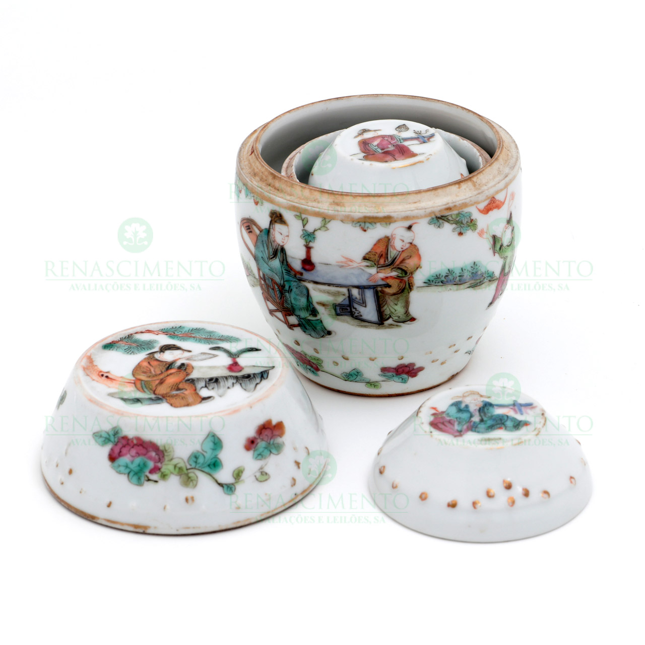 formato de barricas, em porcelana chinesa, Dinastia Qing, decoração ricamente policromada representanco cenas de exterior com figuras orientais e Meninos Sorridentes. Uma caixa com esbeiçadela no encaixe. Alt.: de 5 cm a 9 cm.