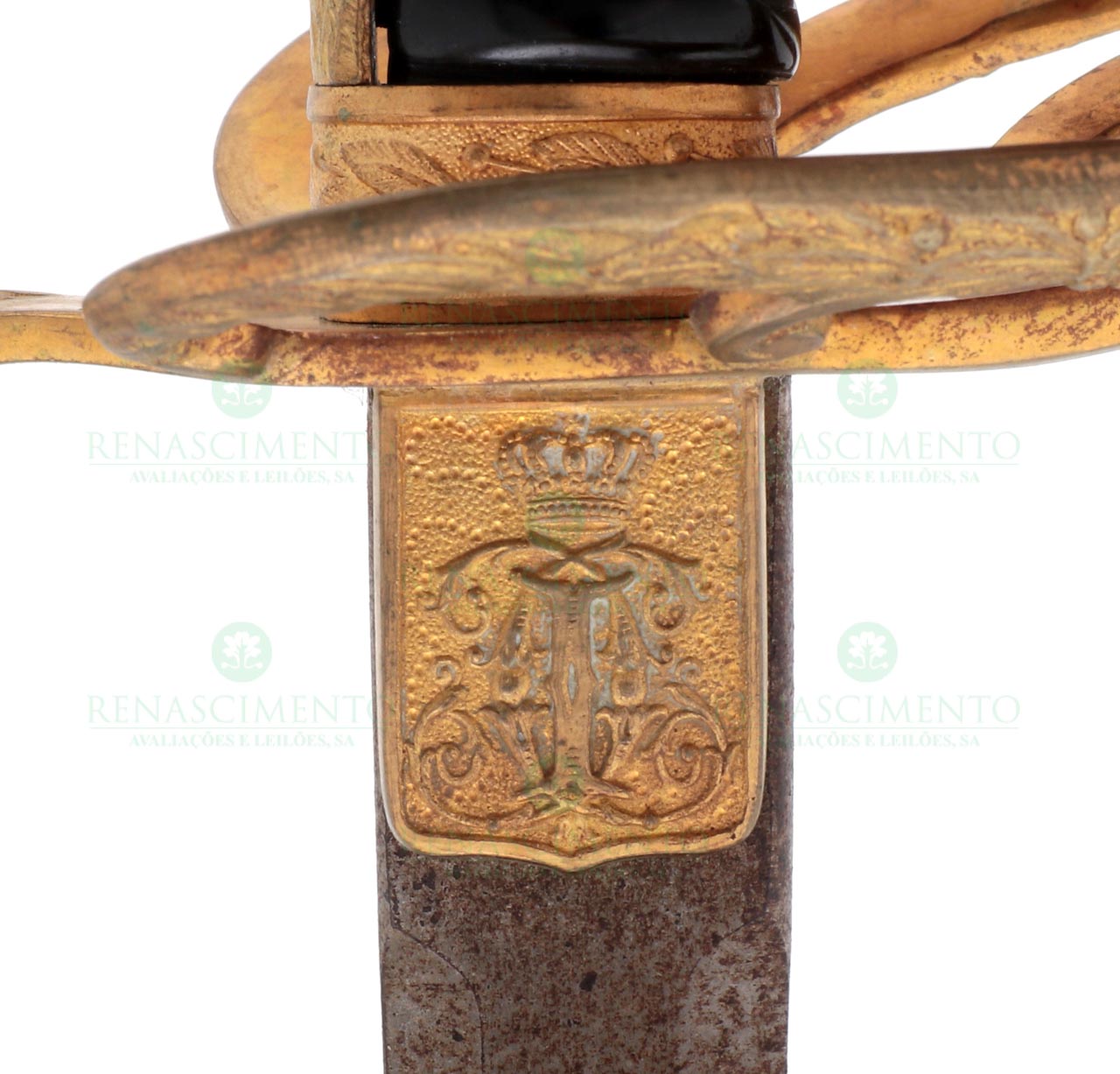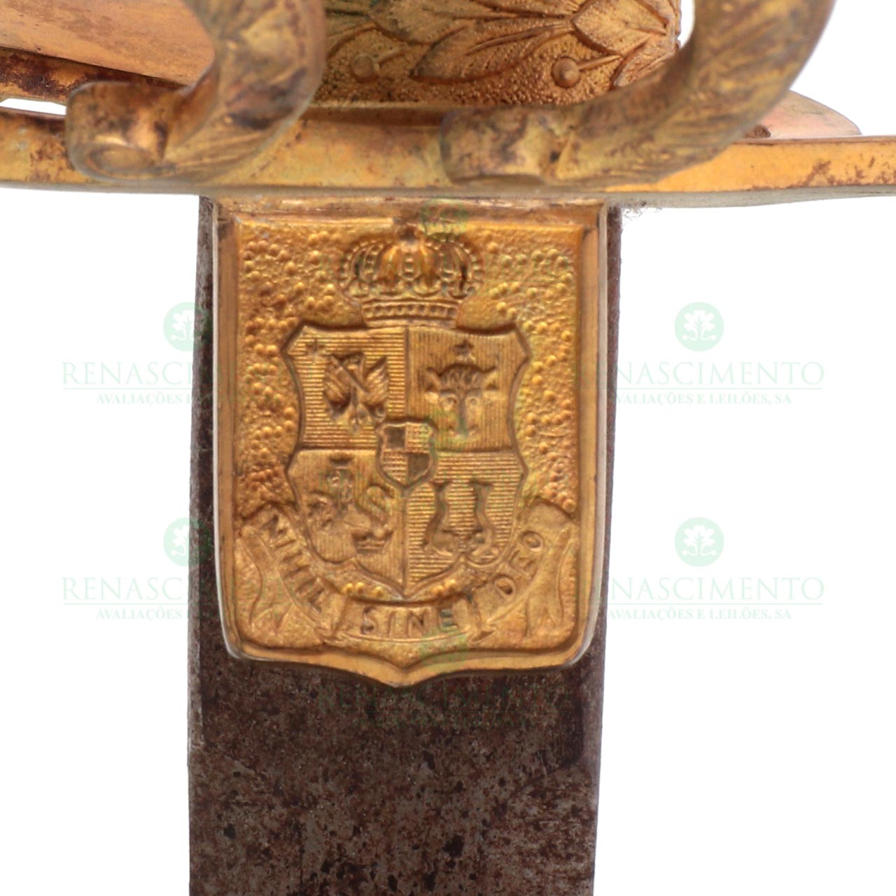 em bronze dourado ricamente cinzelado. Adaptações de sabres do Rei Carol I da Roménia, decorado com as Armas Reais e retrato da "Principesa Maria". Pegas dos sabres em ébano e fio metálico, terminando em forma de cabeça de águia com vidros coloridos.França, Séc. XIX/XX. Alt.: 26,5 cm.