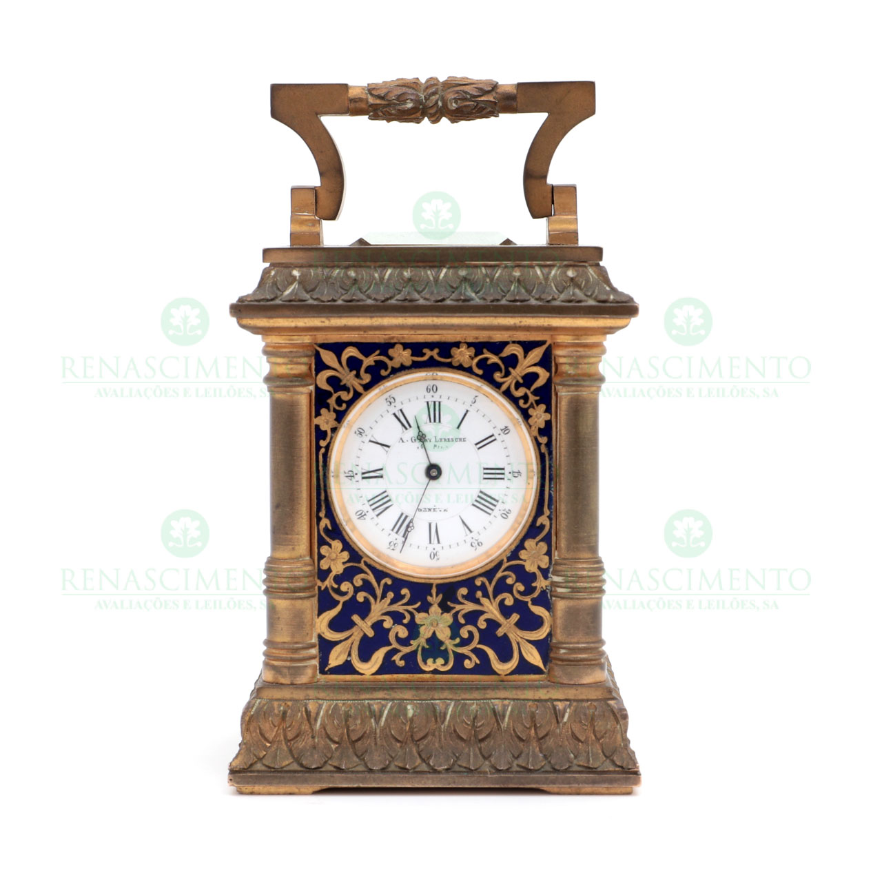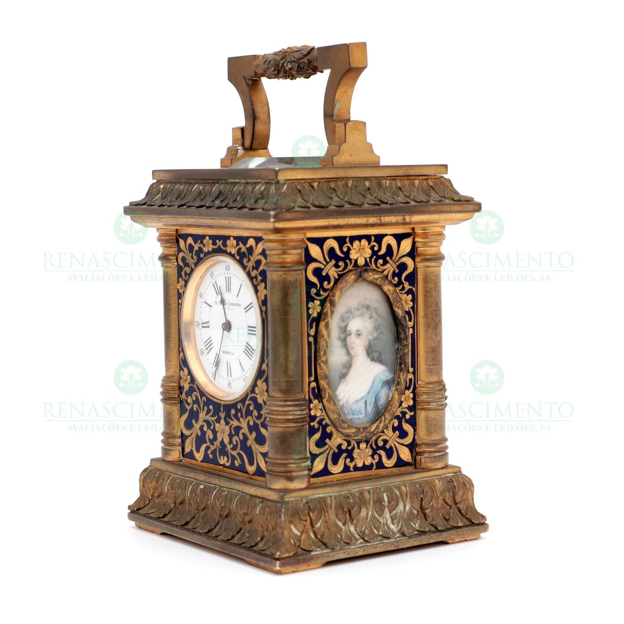em bronze dourado e cinzelado, esmaltado a azul com incrustações em metal amarelo de motivos vegetalistas, tendo nas laterais duas pinturas à maneira miniatural representando figuras femininas. Mostrador esmaltado a branco com numeração romana e árabe,marcado "A. GOLAY LERESCHE". Movimento mecânico de chave. Suíça, Séc. XIX. Chave dupla. Não testado. Dim.: 9,7x5,5x5 cm.