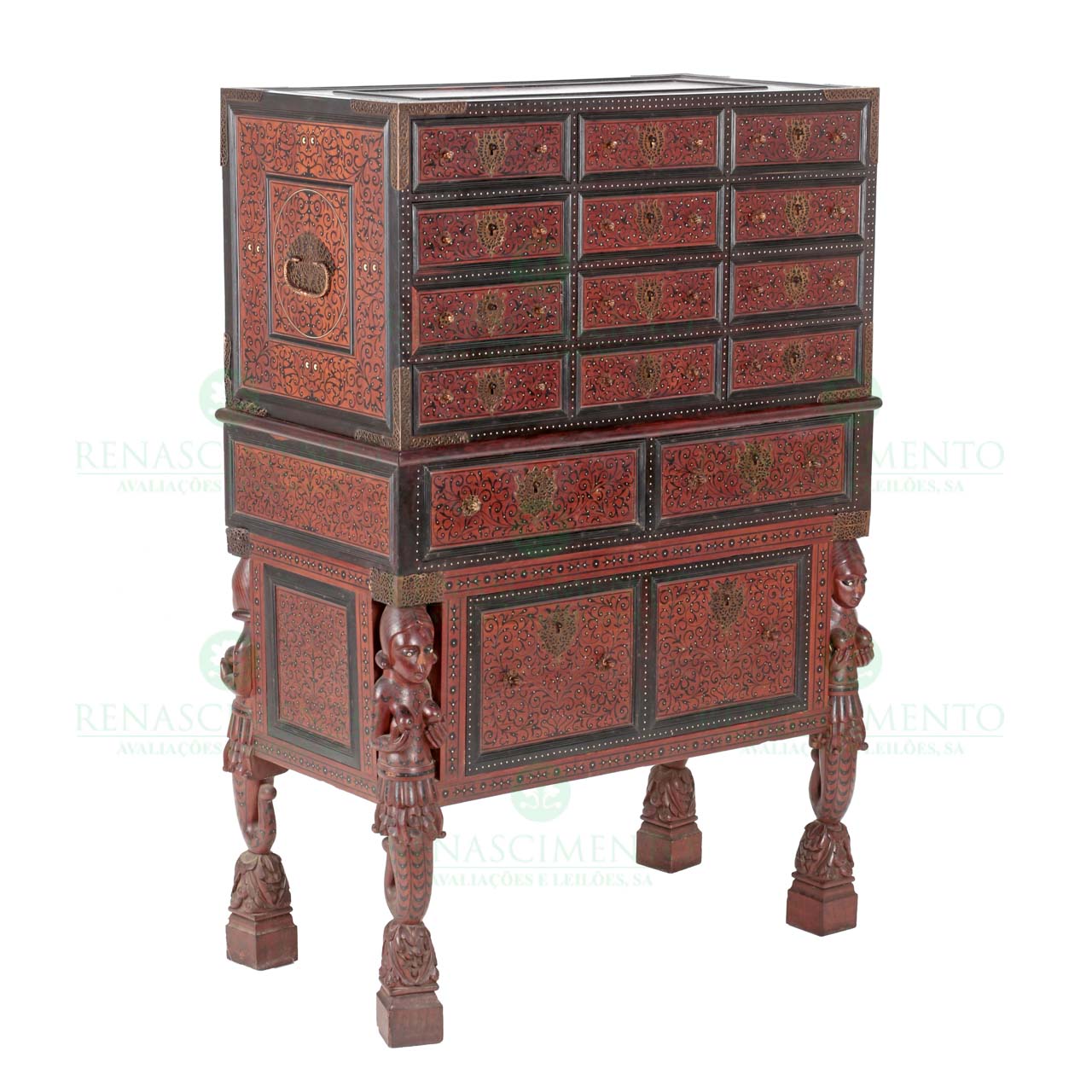 em teca, frisos e embutidos em ébano com rico desenho vegetalista e mascarões com "olhos". Trempe com duas gavetas e gavetão, e caixa com dez gavetas, simulando doze. Pernas entalhadas representando figuras "Nagini". Pegas laterais,ferragens e aplicações em latão dourado vazado. Ínfimos defeitos. Dim.: 130,5x86,5x45 cm.