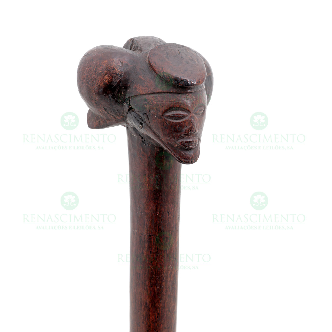em madeira exótica, encimado por cabeça, com patines e desgaste naturais. Angola, Séc. XIX. Alt.: 51,5 cm.