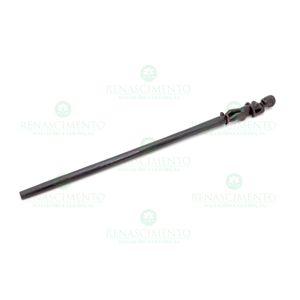 em madeira escurecida, encimado por figura feminina com toucado. Angola, Séc. XX. Alt.: 92,5 cm.