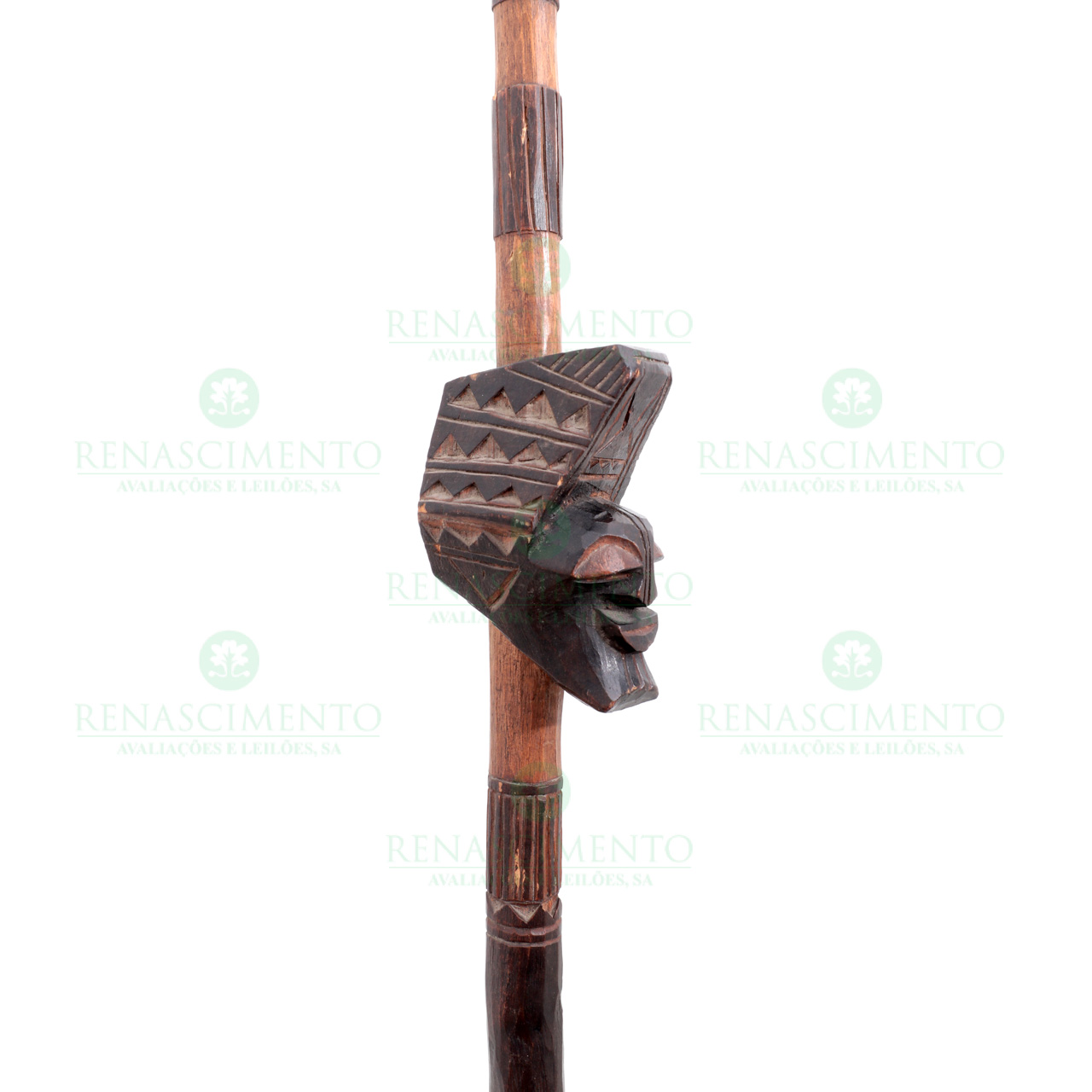em madeira esculpida, natural e escurecida e metal. Congo, Séc. XX. Defeito. Alt.: 124,5 cm.