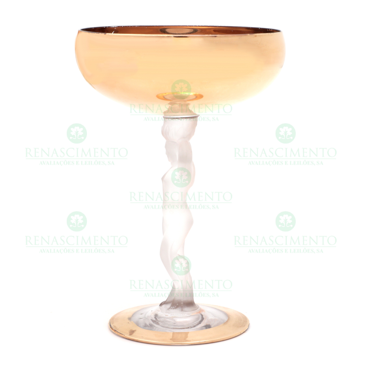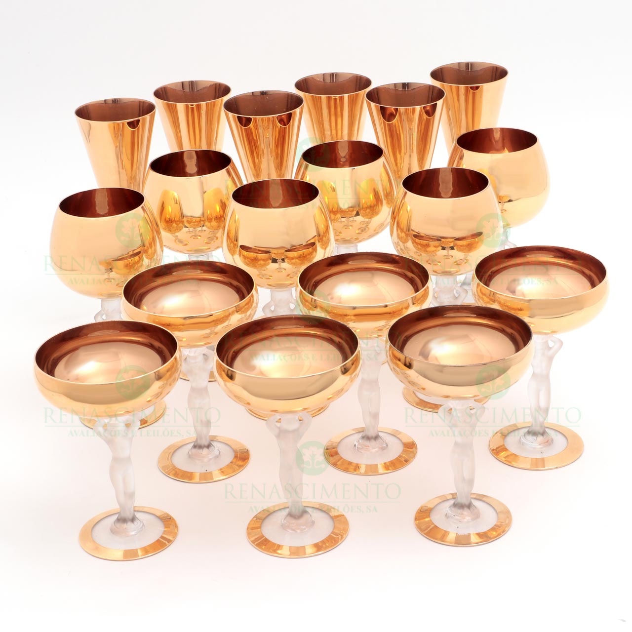 em vidro de Veneza, fuste fosco em forma de figura feminina e bases e bojo dourados. Composto por: seis copos para vinho, seis flutes e seis taças para champanhe. Pequenos desgastes no ouro. Alt.: entre 14,5 cm e 21 cm.