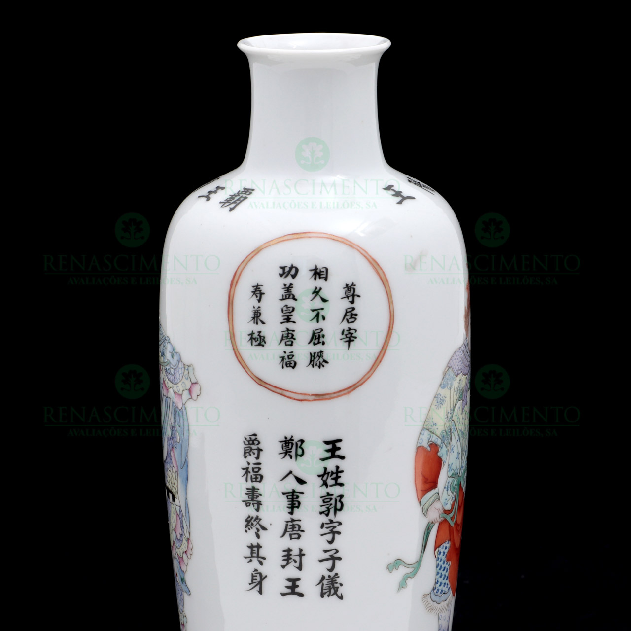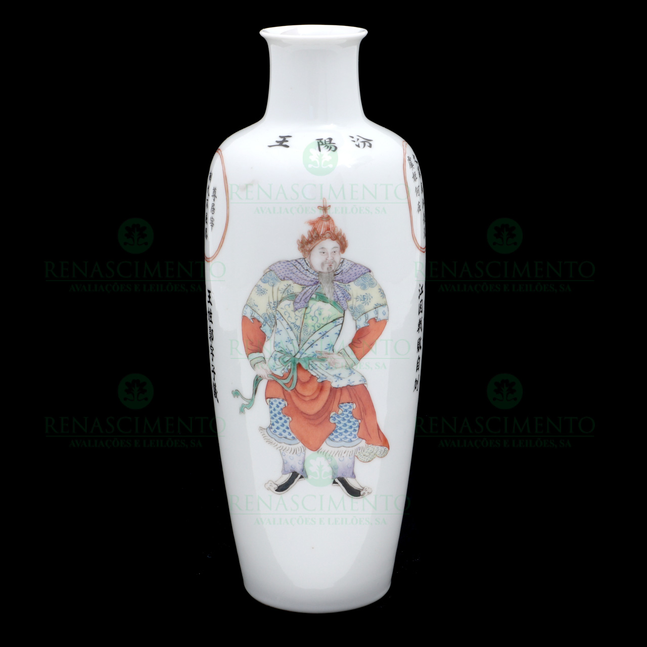 em porcelana chinesa, Dinastia Qing, Séc. XIX/XX, ricamente policromada representando guerreiro e dignitário com caracteres. Marcada. Alt.: 23 cm.