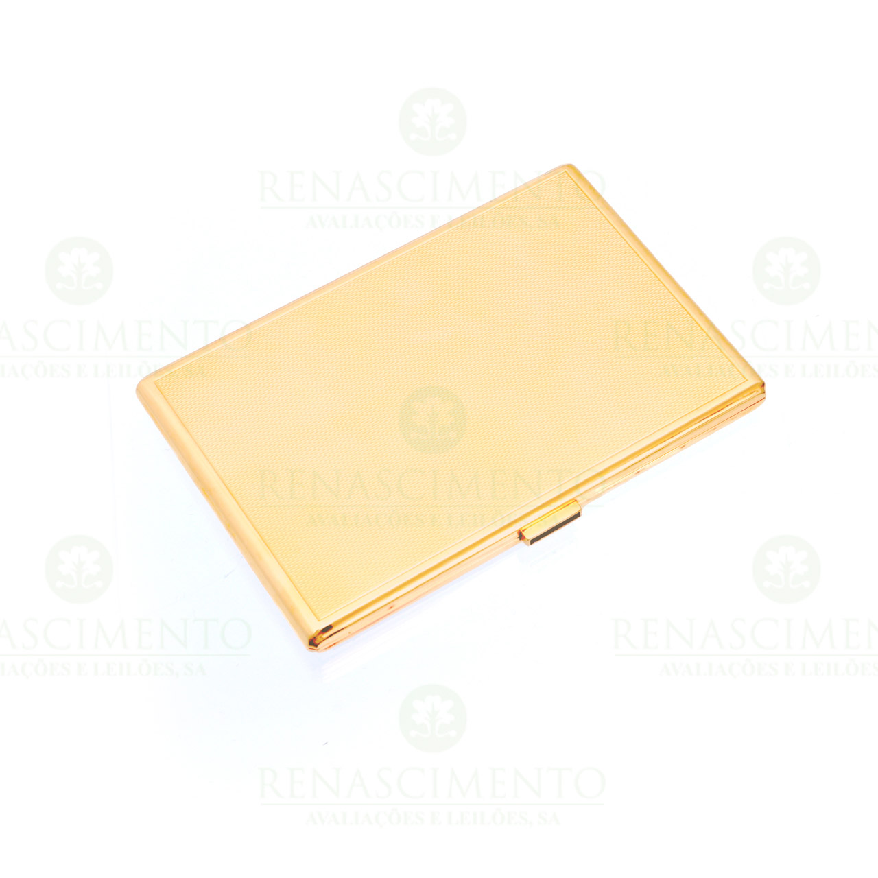 em ouro de 800 milésimos, decoração guilhochada, fecho cravejado com safiras calibradas, interior com inscrição, contraste do Porto (1938-1984), marca de ourives de José Bernardo Moutinho Russo (1887-1986). Estojo da casa Leitão & Irmão. Peso: 203,6 g.
