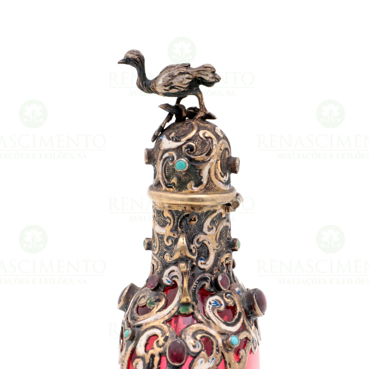 vidro rubi com aplicações em prata, em marcas, ao abrigo do Decreto-Lei 120/2017, de 15 de Setembro - art. 2º, n.º 2, alínea c), com esmaltes e pedras coloridas. Tampa encimada por "ema". Trabalho austro-húngaro do Séc. XIX. Faltas e defeitos.Alt.: 15 cm. Peso bruto: 140,2 g.