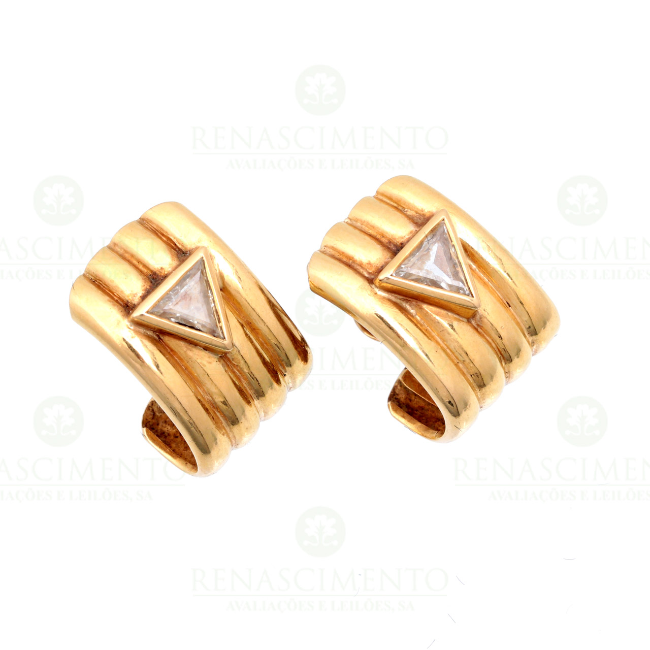 em ouro de 800 milésimos, cravejados com dois diamantes em talhe de triângulo com o peso aproximado de 0,66 ct., contraste de Lisboa (1985-2020). Sinais de uso. Peso: 8,3 g.