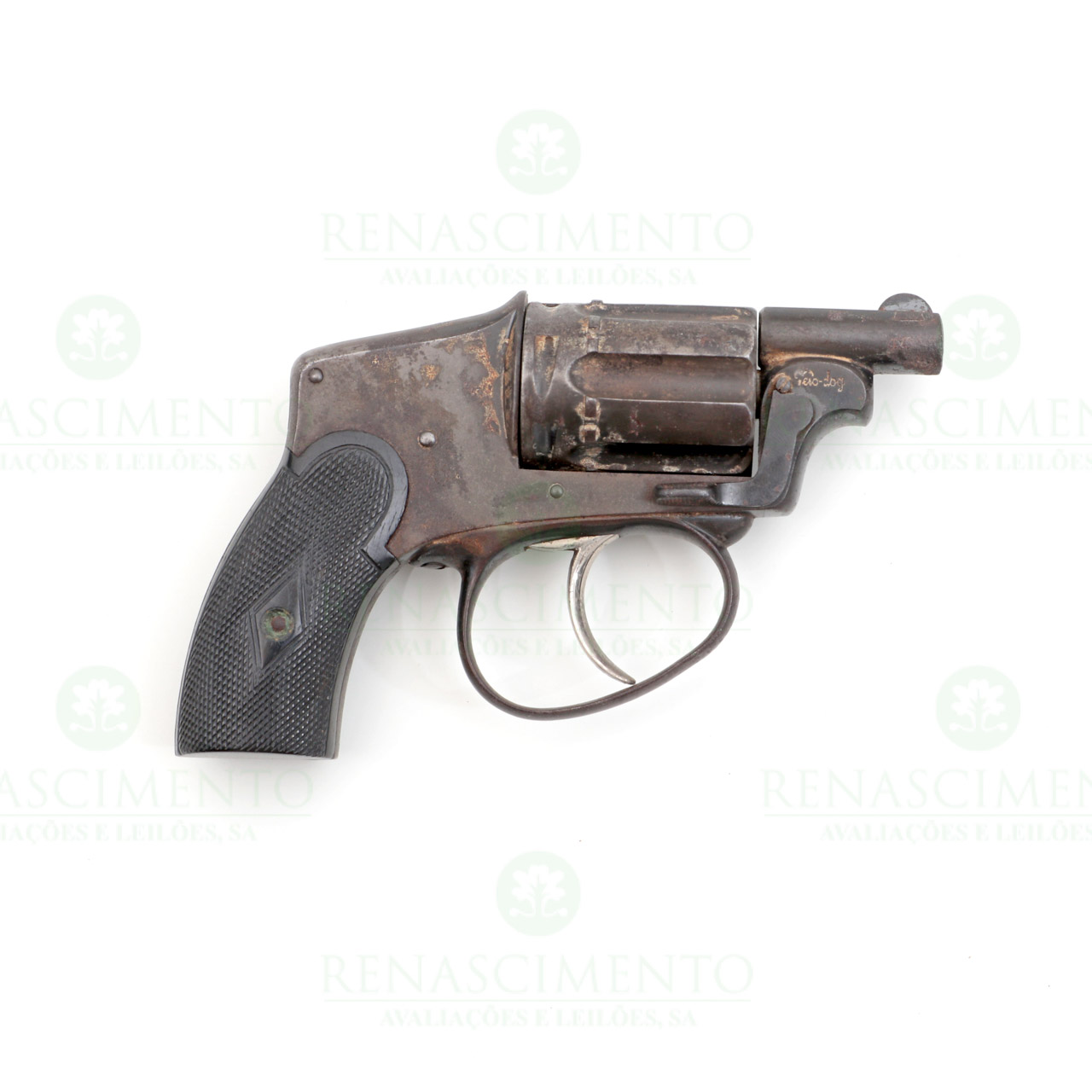De um cano cilíndrico com mesa na parte superior, tendo de um lado a inscrição "GALAND PARIS" e do outro "Velo-dog". de seis câmaras. Carcaça em ferro com o número 11979, guarda-mato do mesmo metal e platinas da coronha em baquelite com recartilha.Ligeira oxidação e sinais de uso. Comp. total aprox.: 11,5 cm. Cal: 5,75 mm Velo-Dog (obsoleto).