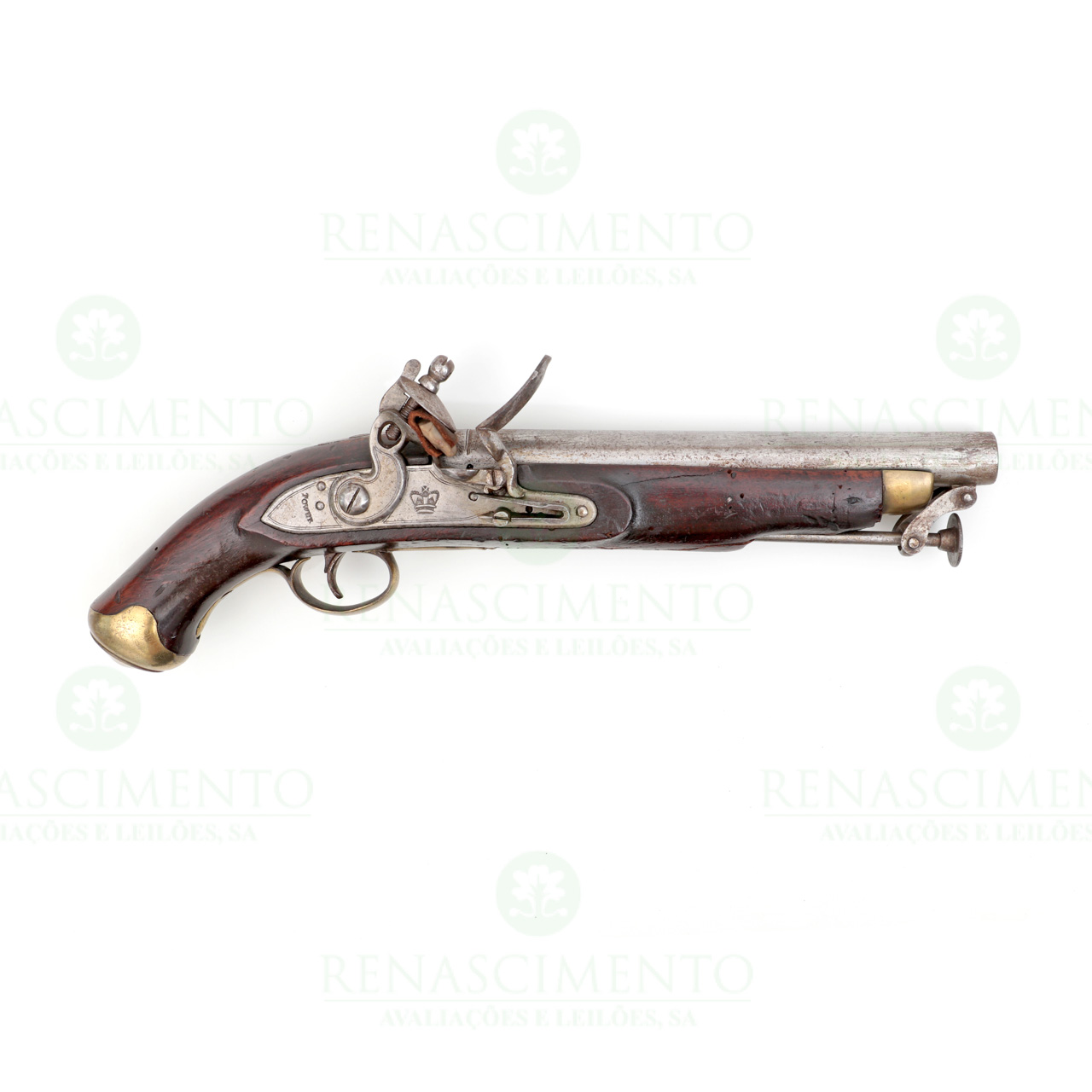 SÉC. XIX), Com um cano, de carregamento pela boca, cilíndrico, com as punções de prova e vistoria de Birmingham na sua parte superior. Fecho lateral de pederneira, com cão do tipo "de argola", tendo a platina a inscrição "TOWER" e Coroa Real inglesa.Coronha em madeira tendo, na parte inferior, marcas regimentais portuguesas "R5/C/30". Guarnições em latão e vareta articulada em ferro. Sinais de uso e de insectos xilófagos. Comp. total aprox.: 37,5 cm. Cal: 16 mm.
