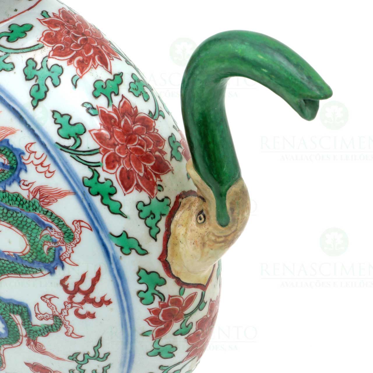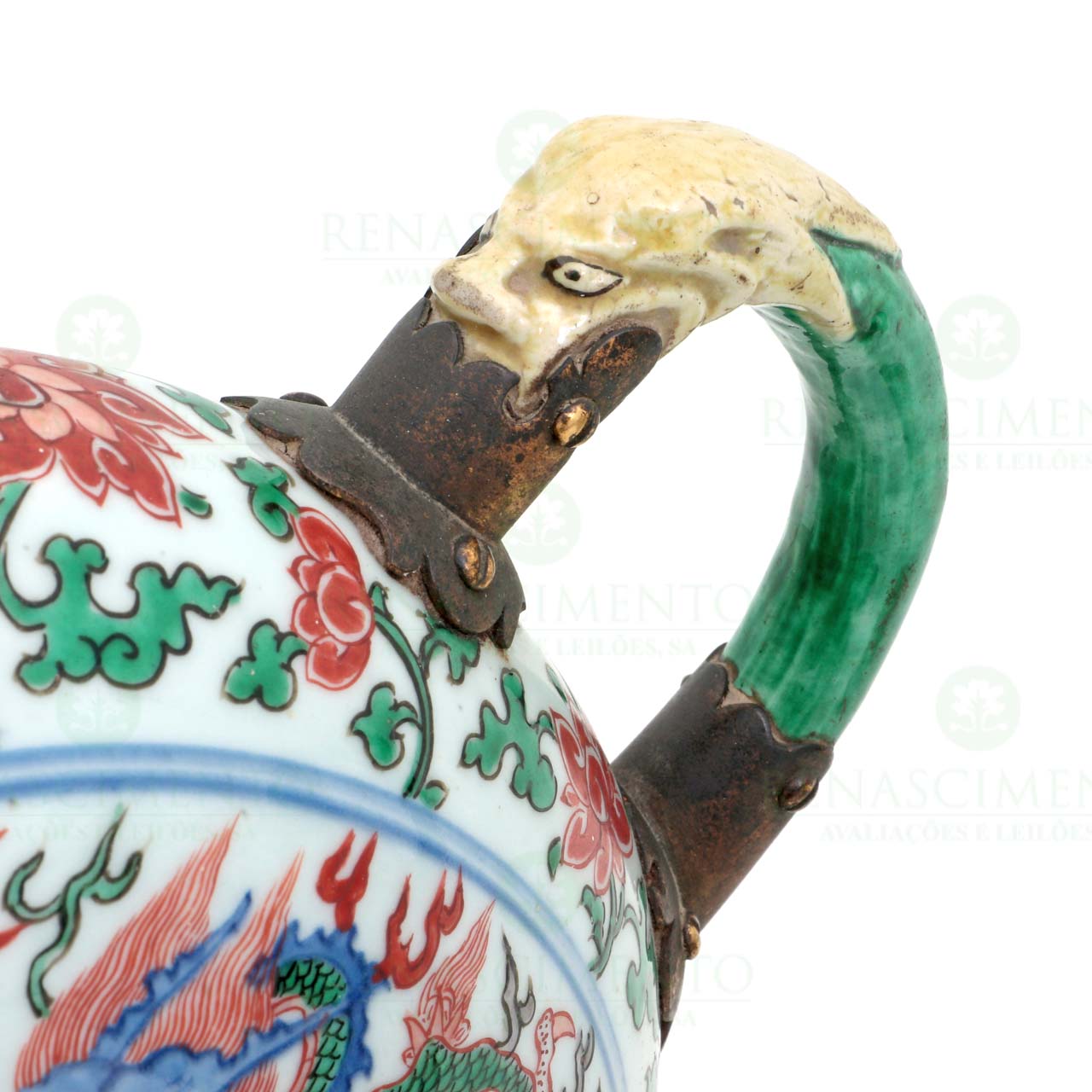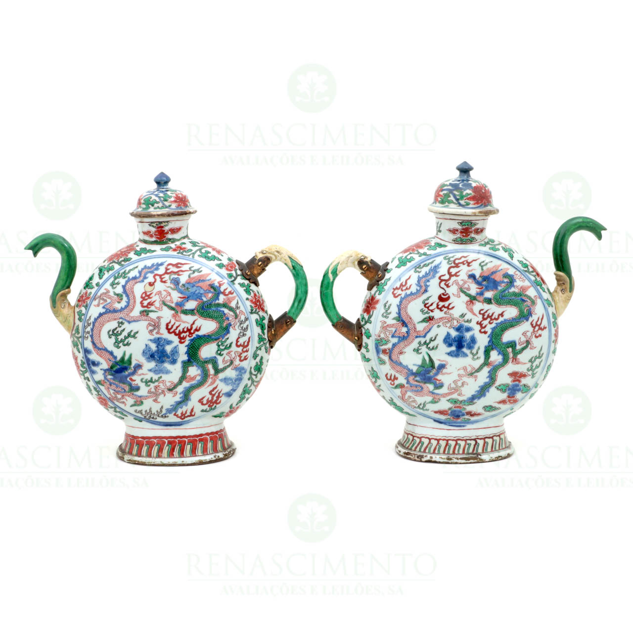 em porcelana chinesa de exportação, transição de Ming para Kangxi (c. 1660), decoração Wucai, tendo de um lado dragões e nuvens e do outro fénixes. Rematada com peónias. Pega e bico zoomórficos, união das pegas em metal amarelo.Tampas e bicos com restauros antigos e ligeira diferença na altura. Alt. 33,5 cm e 34,5 cm.