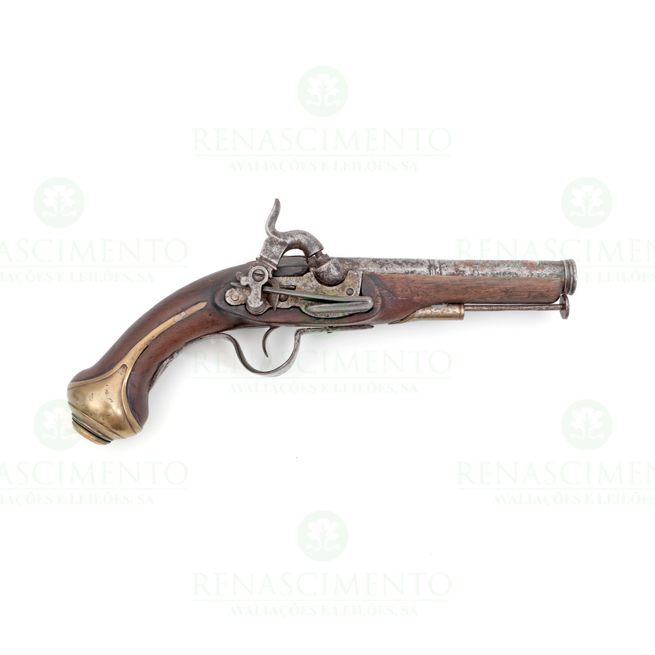 Com um cano, de carregamento pela boca, oitavado na primeira metade passando a cilíndrico, tendo na parte superior vestígios de marcas de armeiro. Fecho lateral do tipo "de patilha", originalmente de pederneira mas transformado para o sistema de percussãoem meados do séc. XIX. Coronha em madeira guarnições em latão e ferro. Vareta, não original, em ferro. Oxidação, faltas e sinais de uso. Comp. total aprox.: 27,5 cm. Cal: 16 mm.
