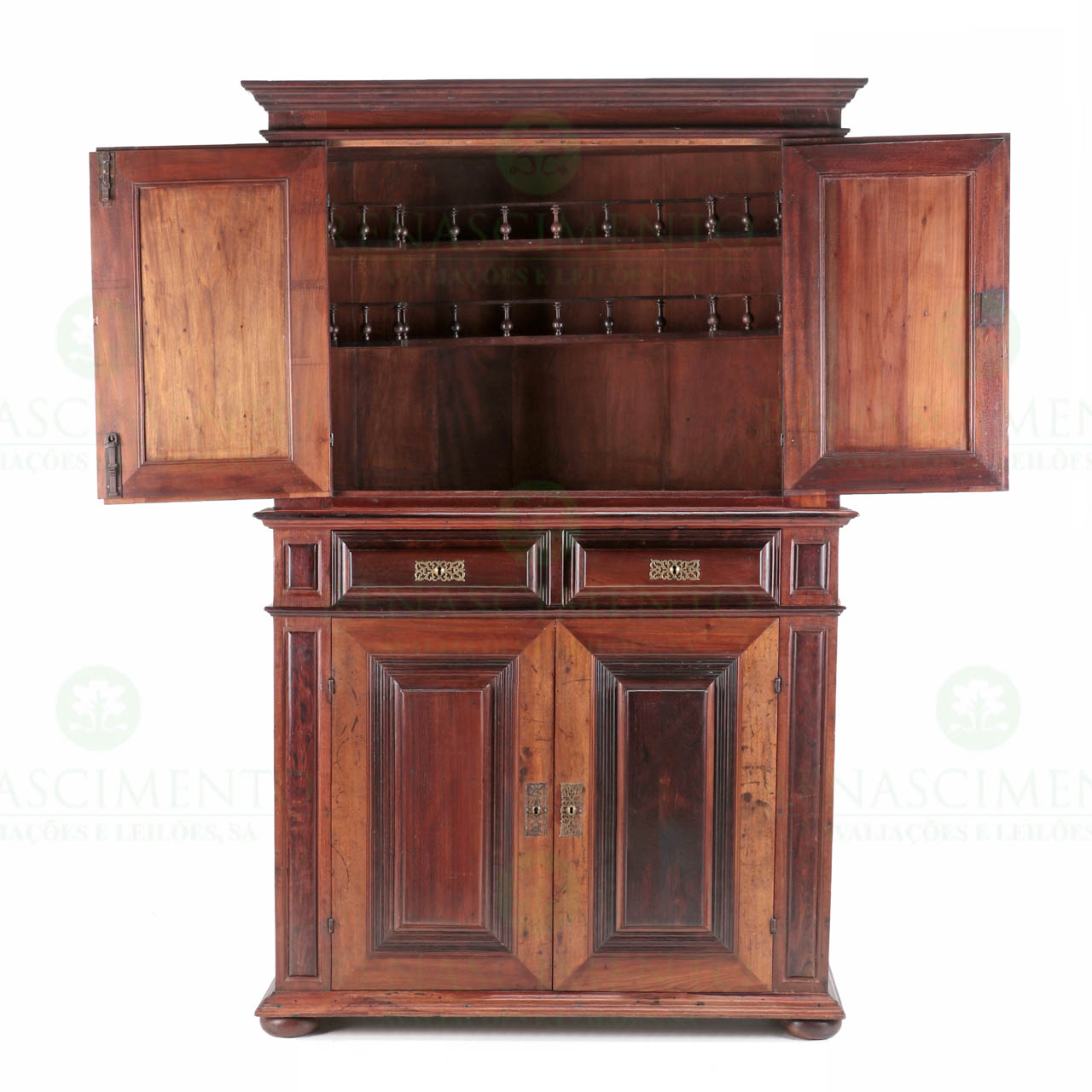 de dois corpos, em vinhático e pau-santo, de frente almofadada. Corpo inferior com duas gavetas e duas portas, e o superior com prateleiras de balaústres no interior. Portugal, Séc. XVII. Dim. 228x143,5x55 cm.
