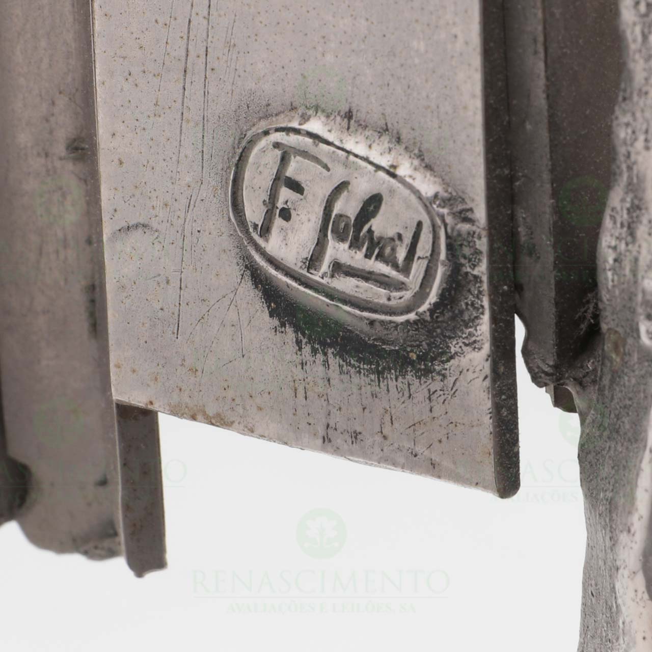 grupo escultórico em metal branco. Assinado. Dim.: 52x31,5x12,5 cm.