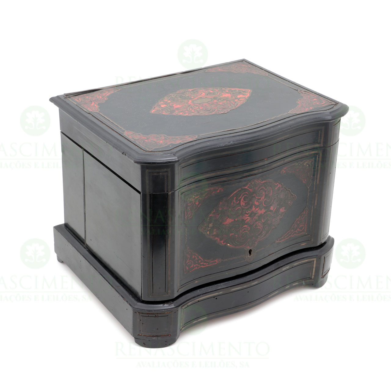 com caixa em madeira ebanizada e incrustações em metal amarelo, contendo 4 frascos e 9 cálices (faltam 6) em cristal com dourados. França, Séc. XIX. Faltas, defeitos e vestígios de xilófagos. Dim. 27,5x34x26,5 cm.