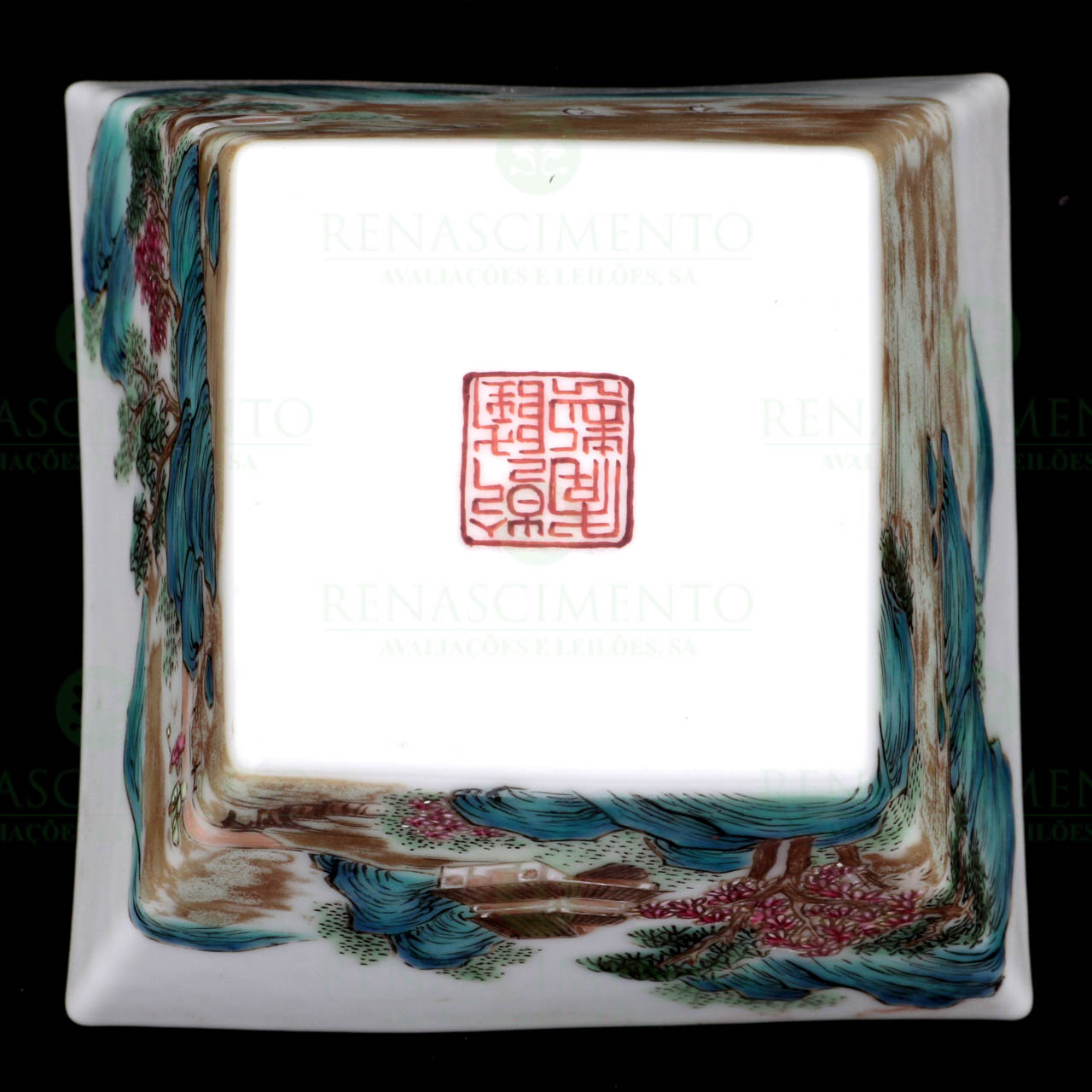 em porcelana chinesa, decorada com paisagem animada, em esmaltes policromados. Marcada. Dim.: 6x8,5x8,5 cm.