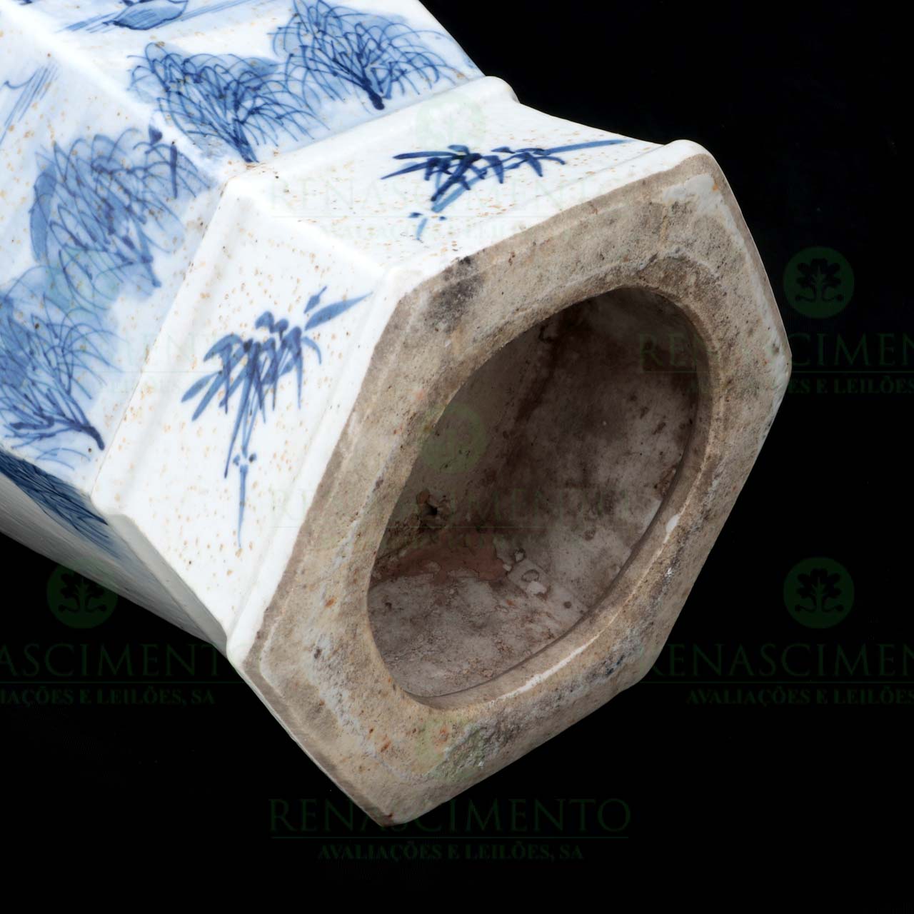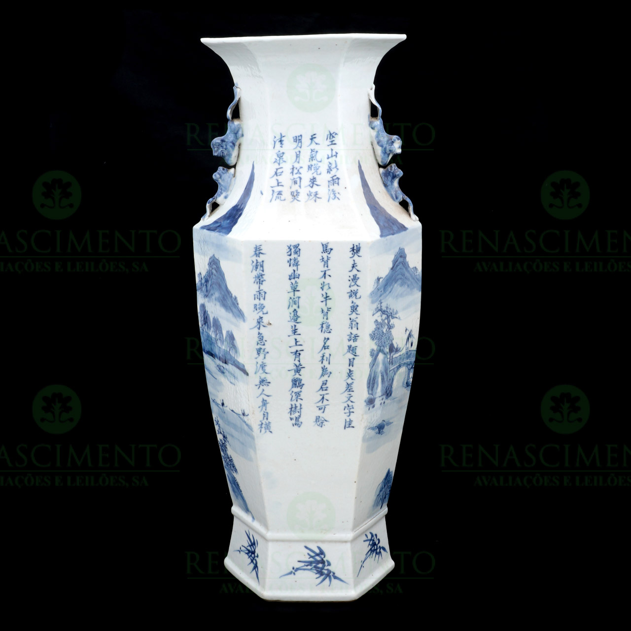 sextavado, em porcelana chinesa, Dinastia Qing, Séc. XIX, decorado a azul e branco representando paisagem fluvial com pagodes e figuras. Caracteres. Asas relevadas em forma de kilins. Ligeiro empeno de fabrico, cabelos e esbeiçadela no bocal. Alt. 56 cm.
