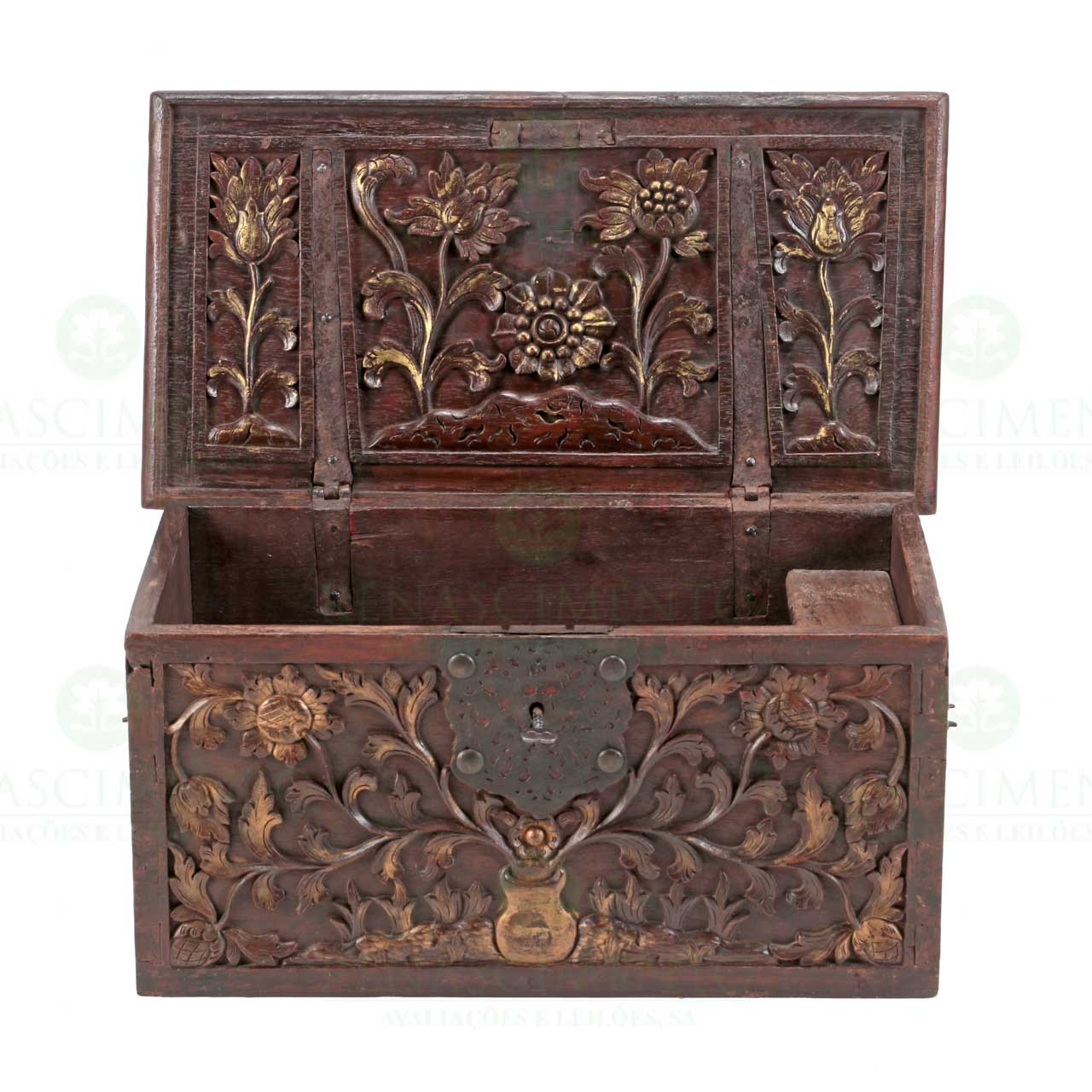 em teca, frente e ilhargas entalhadas e douradas com urnas de flores. Tampa interior igualmente entalhada com flores. Pegas e fecharia em ferro. Antigo Reino do Pegu ou Sul da China, Séc. XVII. Dim.: 34x68x36,5 cm.