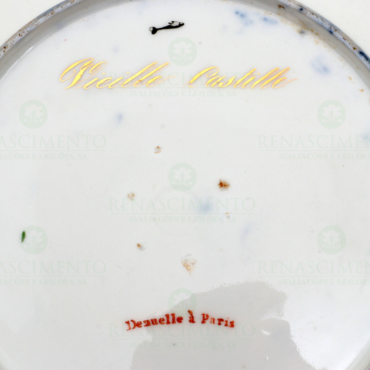 em porcelana francesa de Denuelle à Paris, Séc. XIX, decorações policromadas, representando vistas. Aba a azul e ouro brunido, com iniciais "DC". Dois pratos com cabelo e uma esbeiçadela. Diam.: 22 cm.