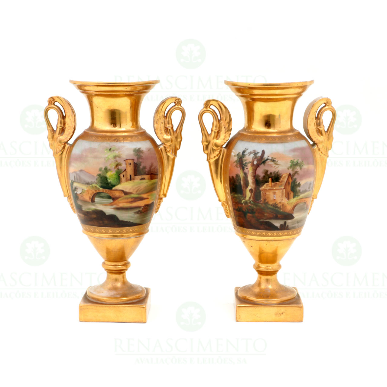em porcelana de Paris, com medalhões policromados alusivos ao fumo e paisagens campestres com casario, sobre fundo a ouro brunido. Asas em forma de cabeças de cisnes. França, Séc. XIX. Alt. 28,5 cm.