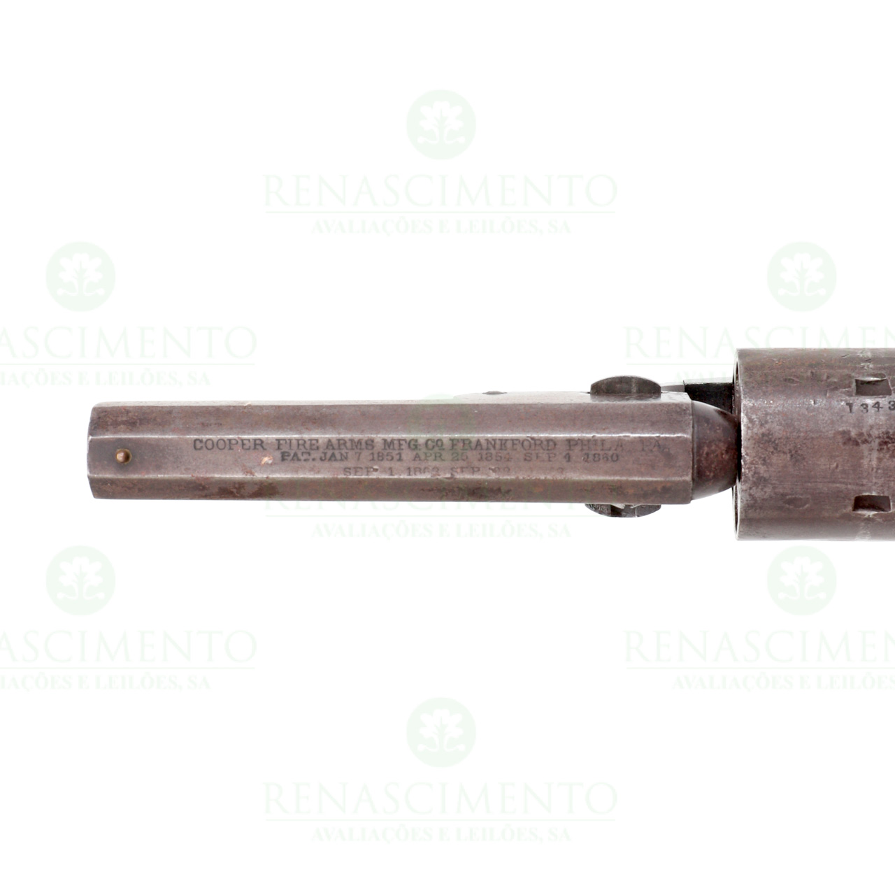 marca "Cooper", modelo "pocket". Com um cano oitavado tendo na sua parte superior a inscrição "COOPER FIRE ARMS MFG. CO. FRANKFORD PHIL A PA. / PAT.JAN 7 1851 APR 25 1854 SEP 4 1860 / SEP 1 1863" e na parte inferior vareta articulada para carregamento.Tambor de seis câmaras de carregamento frontal e de percussão. Carcaça e guarda-mato em ferro com o número 1343. Coronha em madeira. Oxidação e sinais de uso. Comp. total aprox.: 22 cm. Cal: 8 mm.