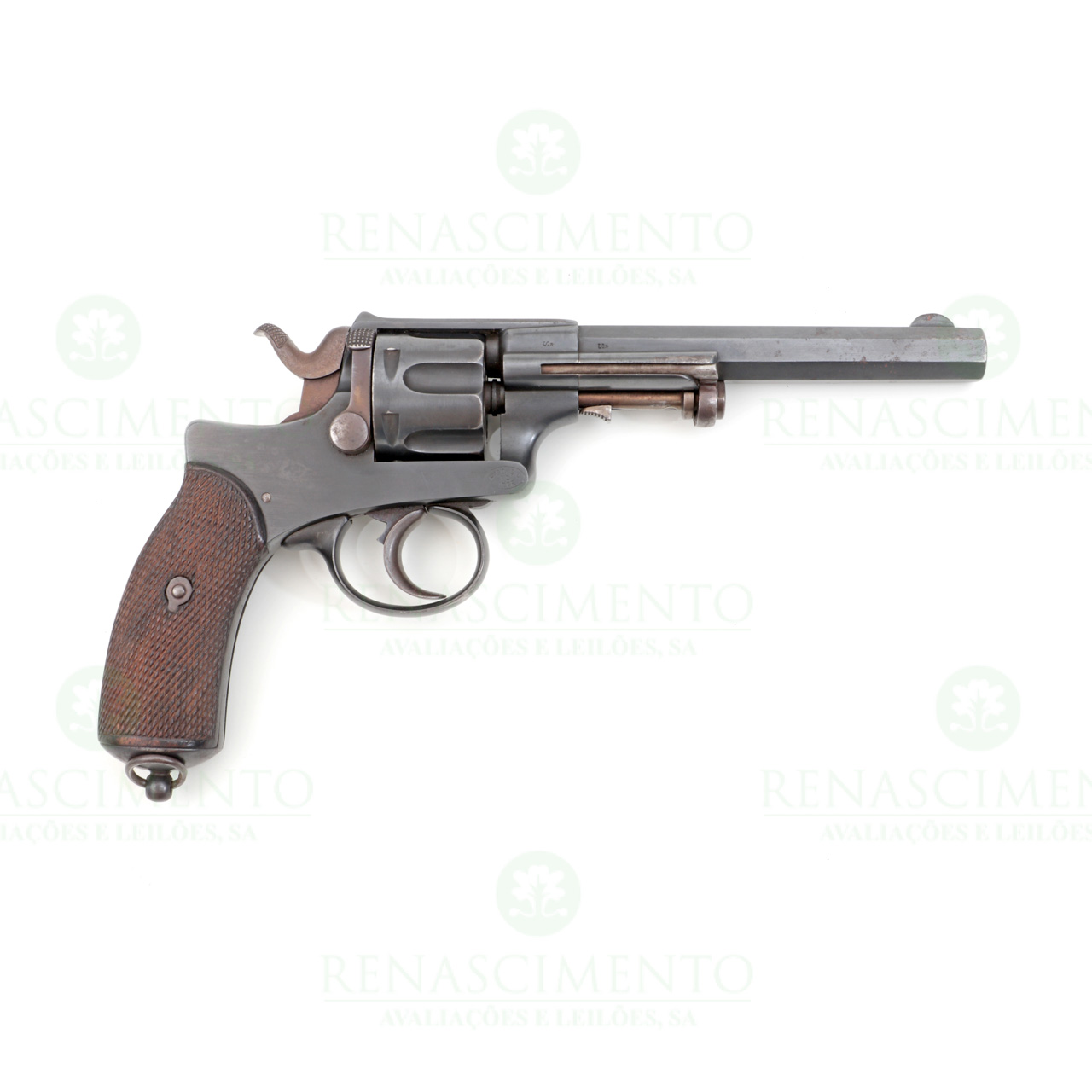 adoptado pelo exército português em 1886 para tropas de cavalaria e artilharia. Com um cano oitavado, estriado, com o número 9717, e vareta de extracção das cápsulas na parte lateral direita. Tambor de seis câmaras. Carcaça em ferro tendo, de um lado ainscrição "SYSTEME ABADIE BREVETE" e a punção "FA" coroada (Fábrica de Armas), e do outro "L. SOLEIL FT. LIEGE". Platinas da coronha em madeira, tendo, no couce, uma argola para passagem de um fiador. Excelente funcionamento mecânico, ligeiros sinais de uso.