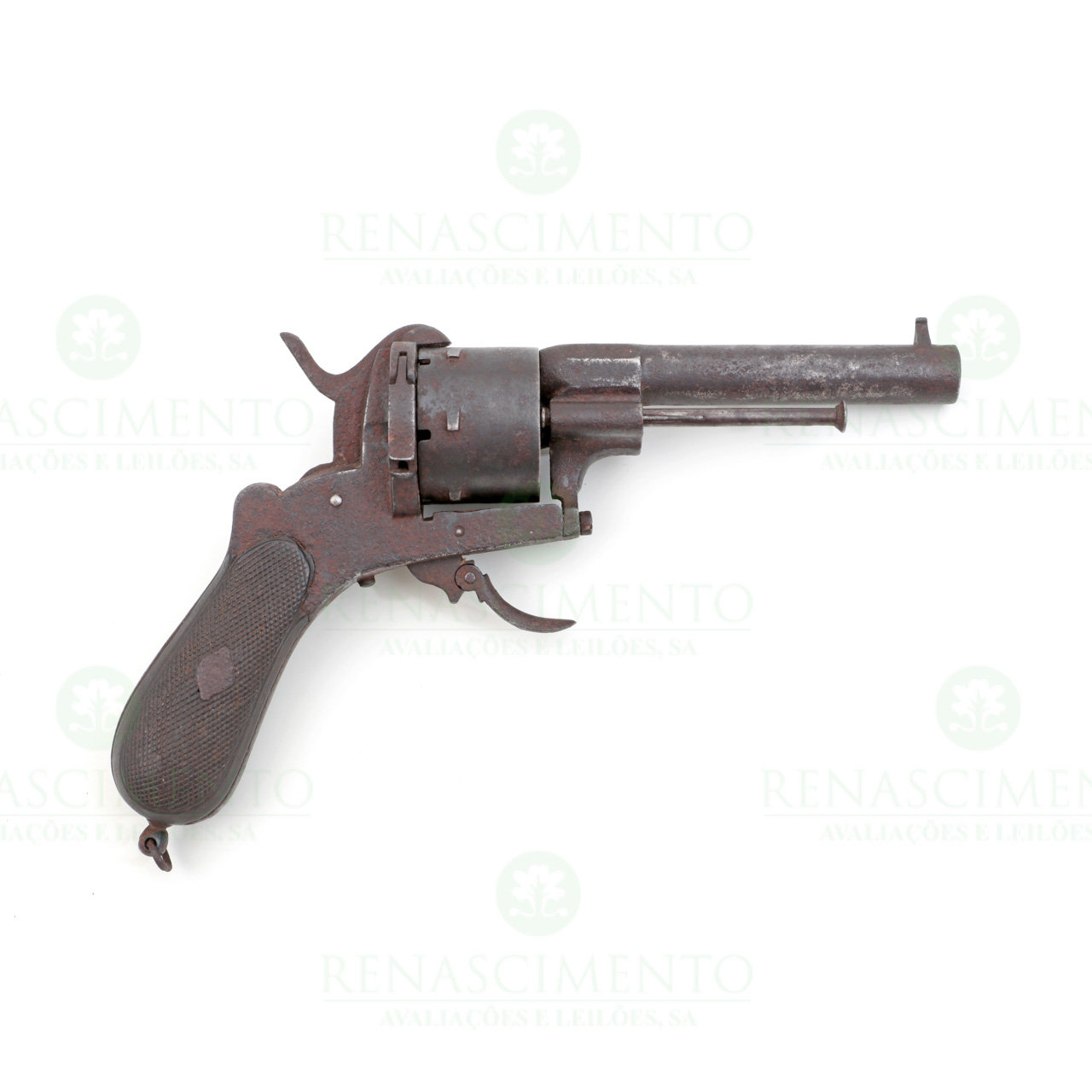 sistema "Lefaucheux", da segunda metade do séc. XIX. Com um cano cilíndrico com vareta de extracção das cápsulas na parte lateral direita. Tambor de seis câmaras. Carcaça em ferro e gatilho basculante. Platinas da coronha em madeira escurecida comcom recartilha incisa. Oxidação e sinais de uso. Comp. total aprox.: 23 cm. Cal: 11 mm.