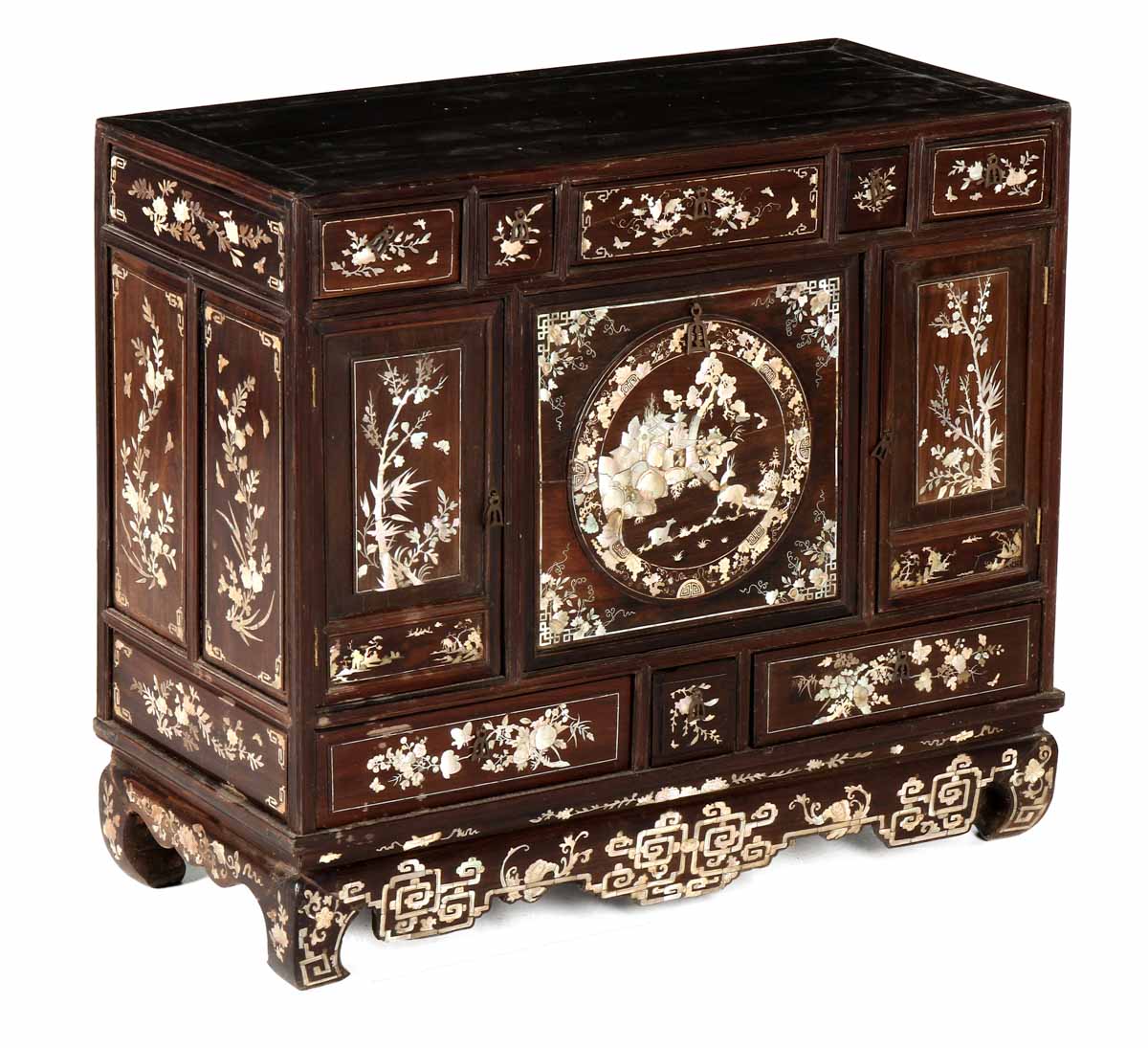 em tamarindo, decorado com embutidos de madrepérola representando paisagens, animais, flores e insectos. China, Dinastia Qing (1644-1911). Dim.: 66x75x34 cm.