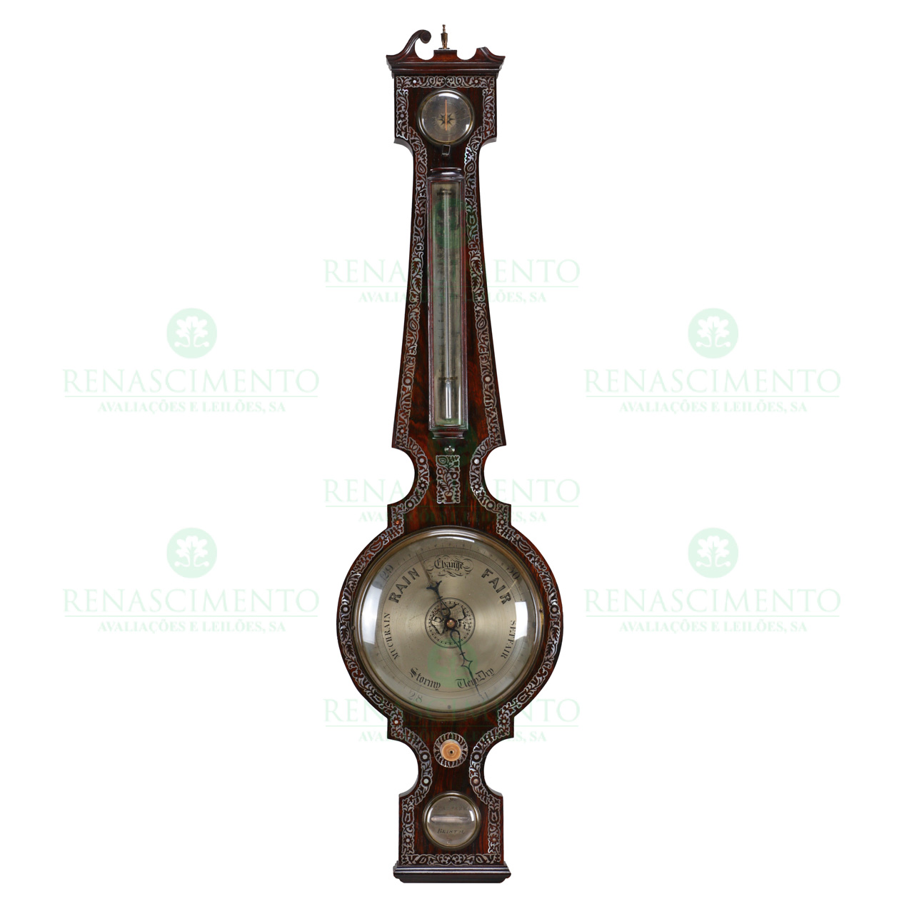 com caixa em pau-santo e incrustações em madrepérola. Com termómetro acoplado. Marcado "P. Pedrene - Bristol". Inglaterra, Séc. XIX. Pequena falta. Alt.: 97 cm.