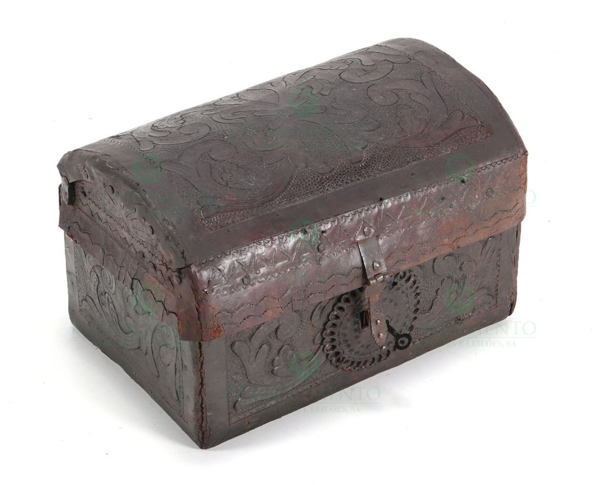 em couro lavrado representando folhagem. Europa, Séc. XVII. Dim.: 24x36,5x26 cm.