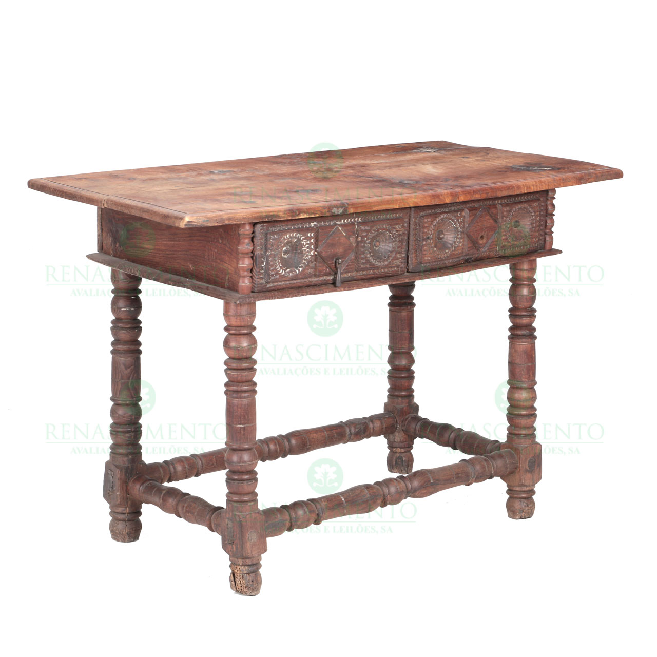 em nogueira, com duas gavetas, sendo as frentes entalhadas. Pernas e travamentos torneados. Ibérica, Séc. XVII. Faltas, defeitos e vestígios de xilófagos. Dim.: 88x129,5x65 cm.