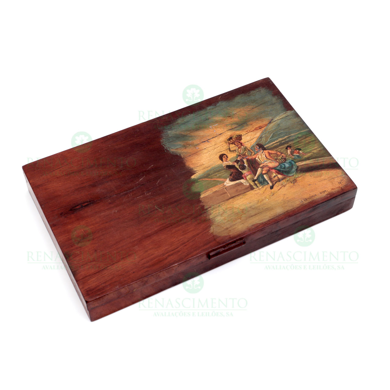 em madeira, tampa com pintura "La Vindima - Goya", assinada. Defeitos. Dim.: 3,5x27x17 cm.