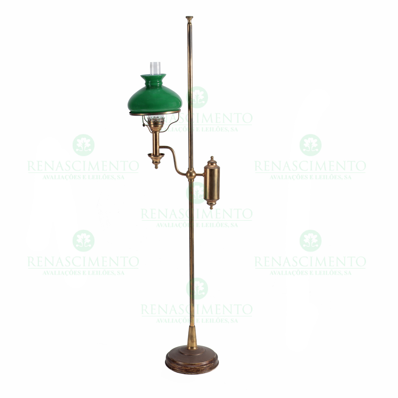 em latão, com abajour em opaline verde. Alt.: 167 cm.