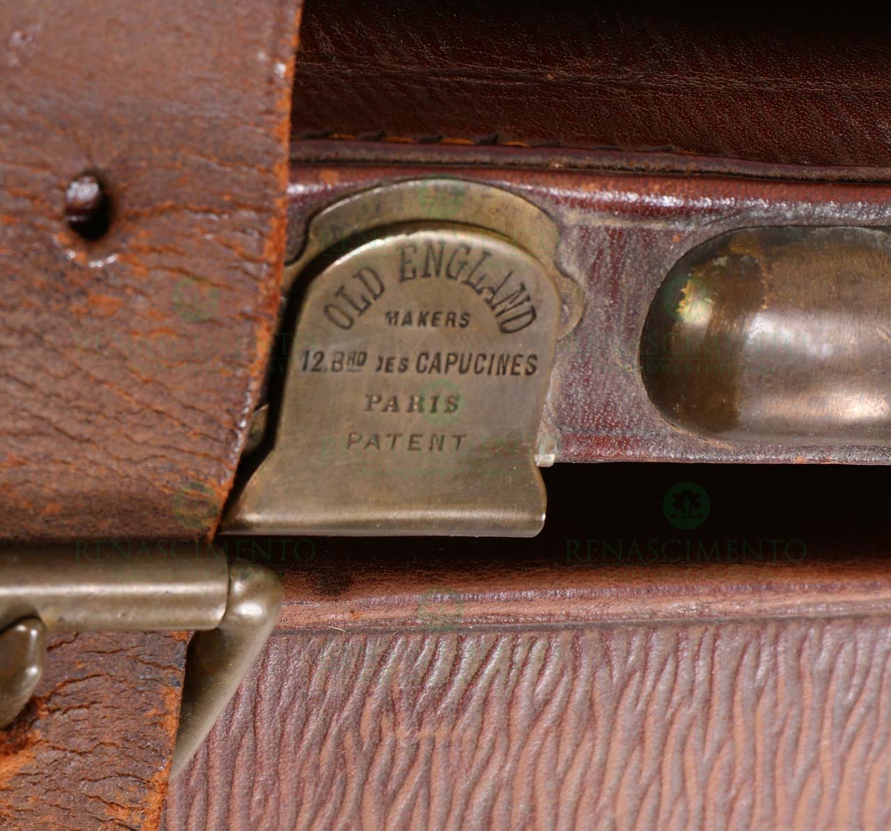 em cabedal e metal, marcada "Old England Makers, Boulevard des Capucines - Paris". Com iniciais gravadas no couro "JMD". Sinais de uso.