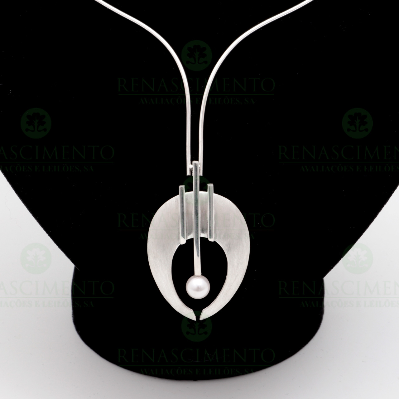 em prata de 925 milésimos, centro com uma pérola de cultura (não testada), contraste de Lisboa (1985-2020), assinado FILIPE CARACOL. Peso: 20,9 g.