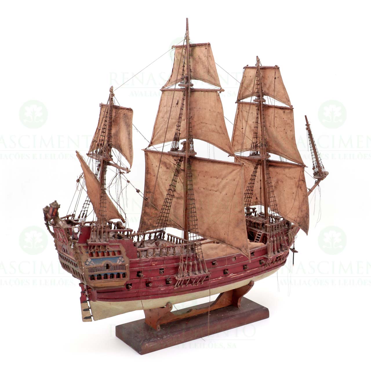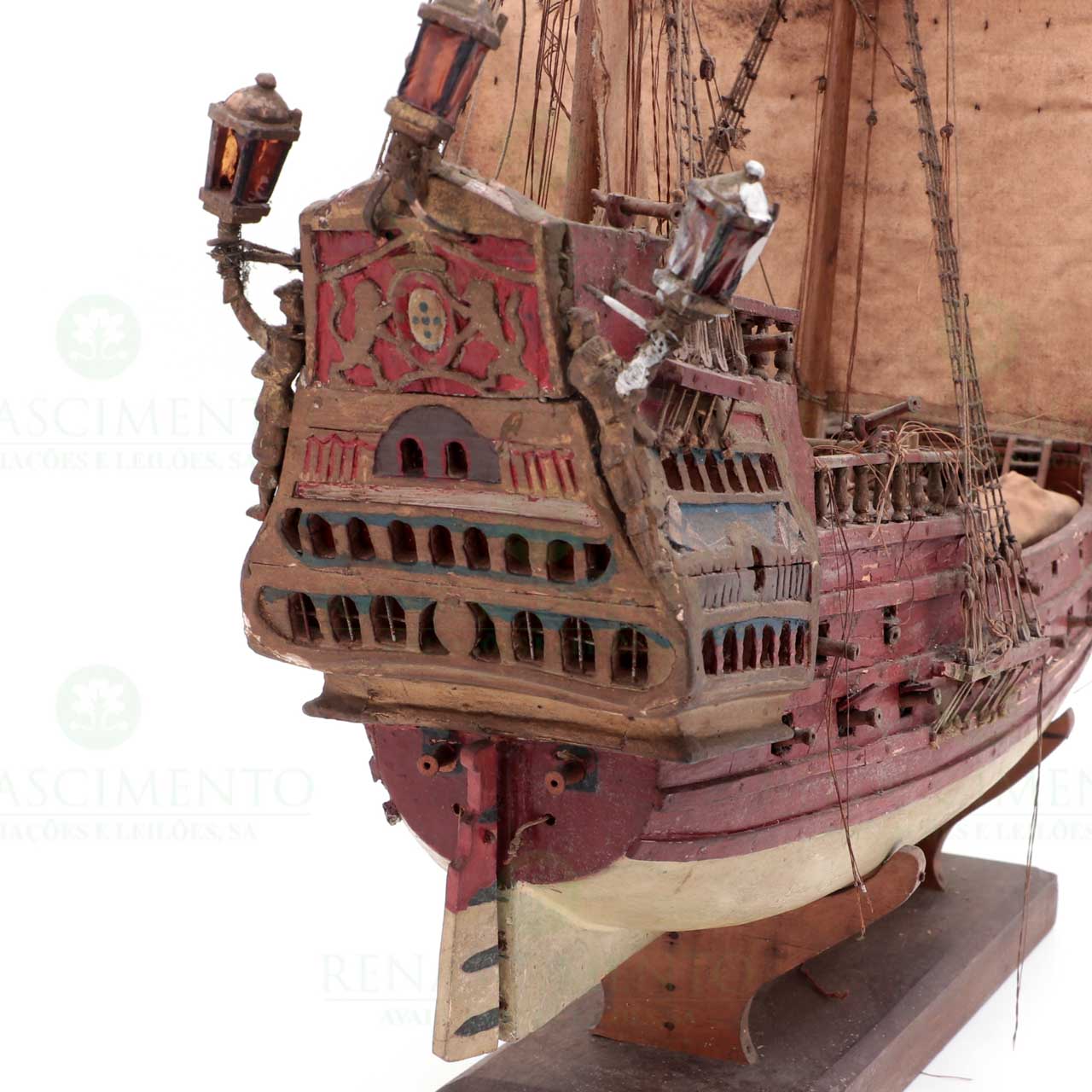 maquete de navio de linha do Séc. XVIII, em madeira, tecido e outros materiais, pintado e decorado com as armas de Portugal na popa. Muitas faltas e defeitos. Dim.: 66x72x29 cm.