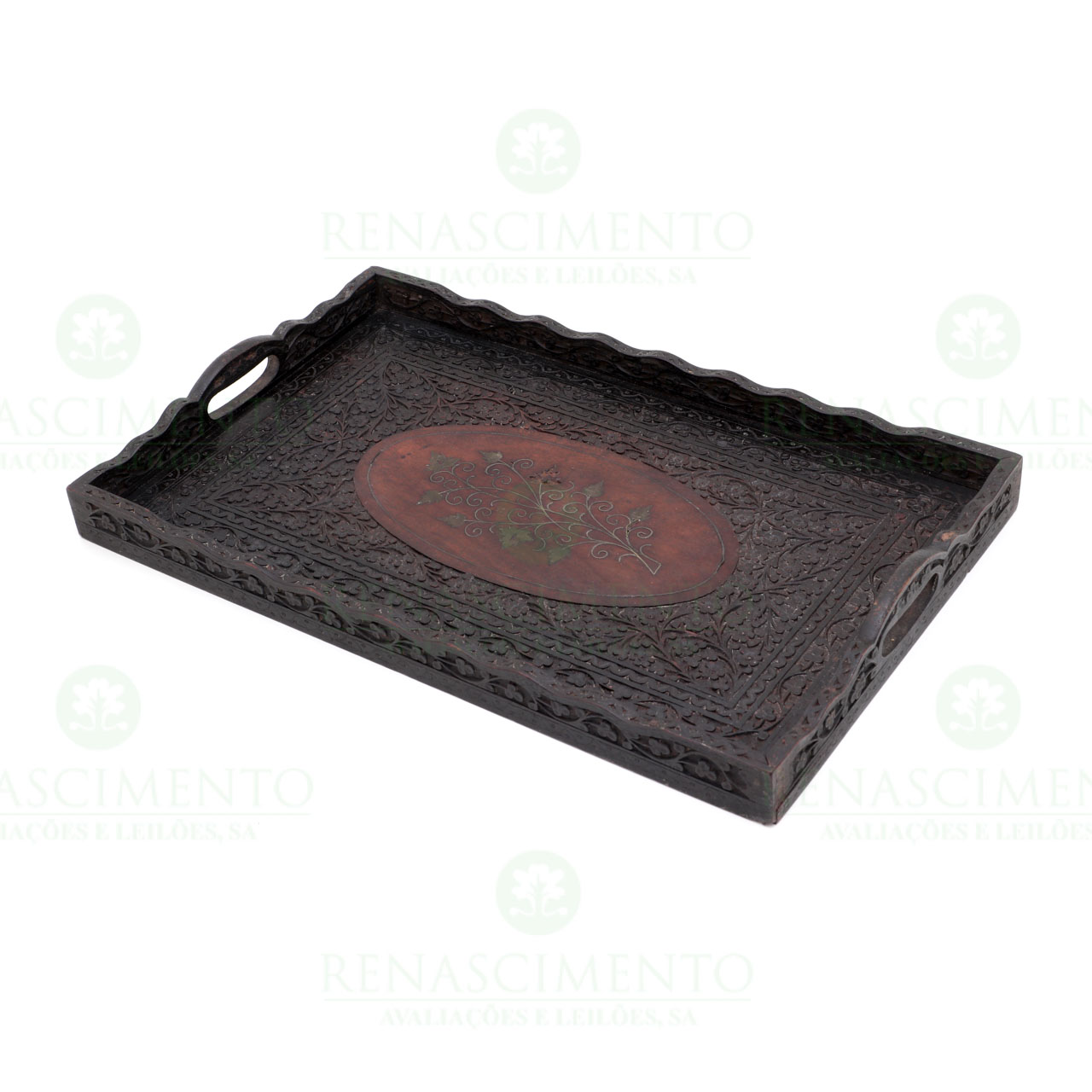em sissó, decoração esculpida com motivos florais, centro com incrustação em metal representando parras (falta). Sinais de uso. Dim.: 48,5x30,5 cm.