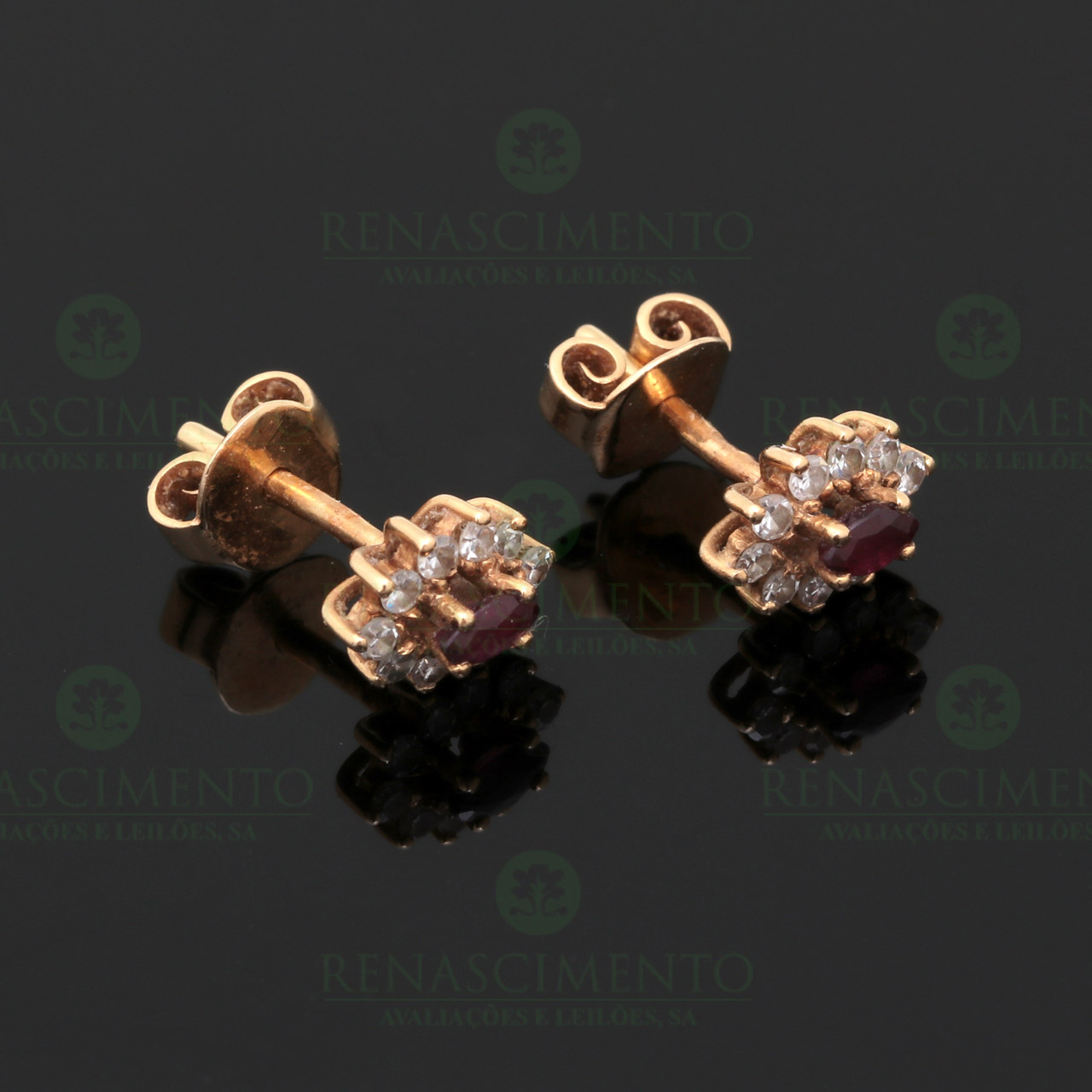 em ouro de 800/000, cravejado com 2 rubis em talhe navete e 20 diamantes em talhe de brilhante com o peso aproximado de 0,20 ct., contraste do Porto (1938-1984). Sinais de uso. Peso: 1,7 g.